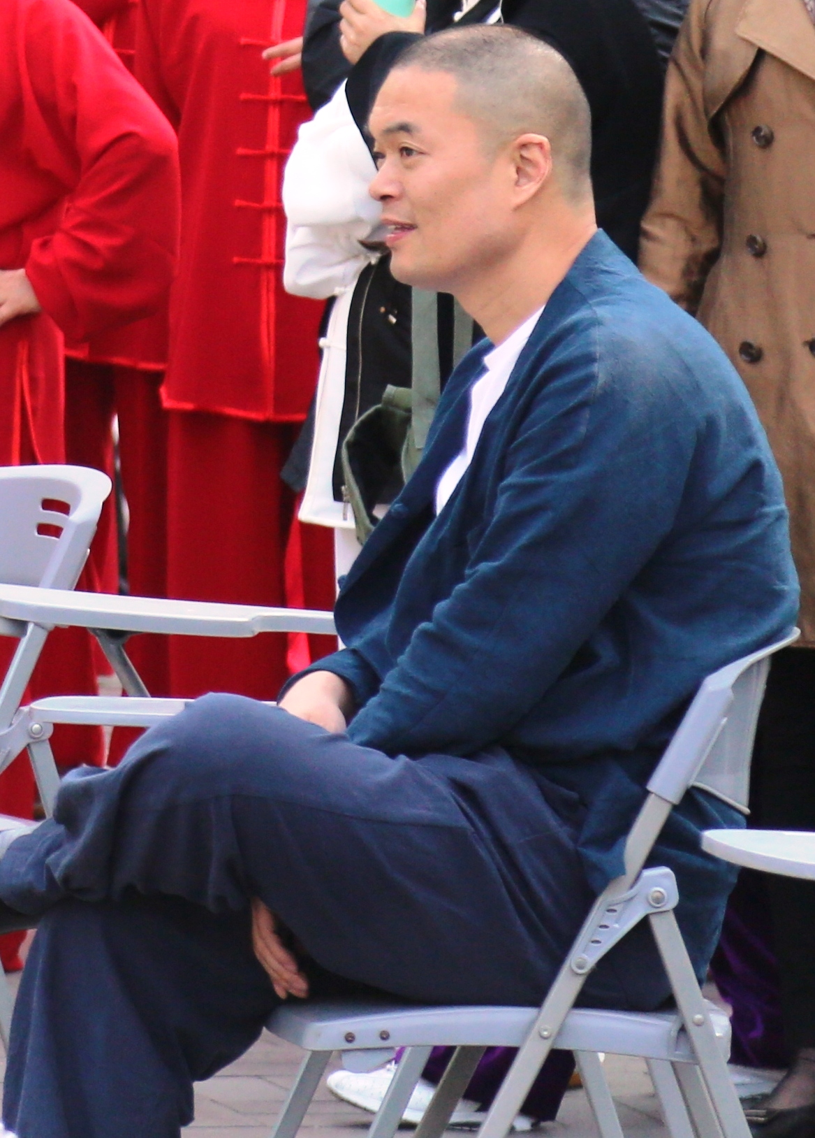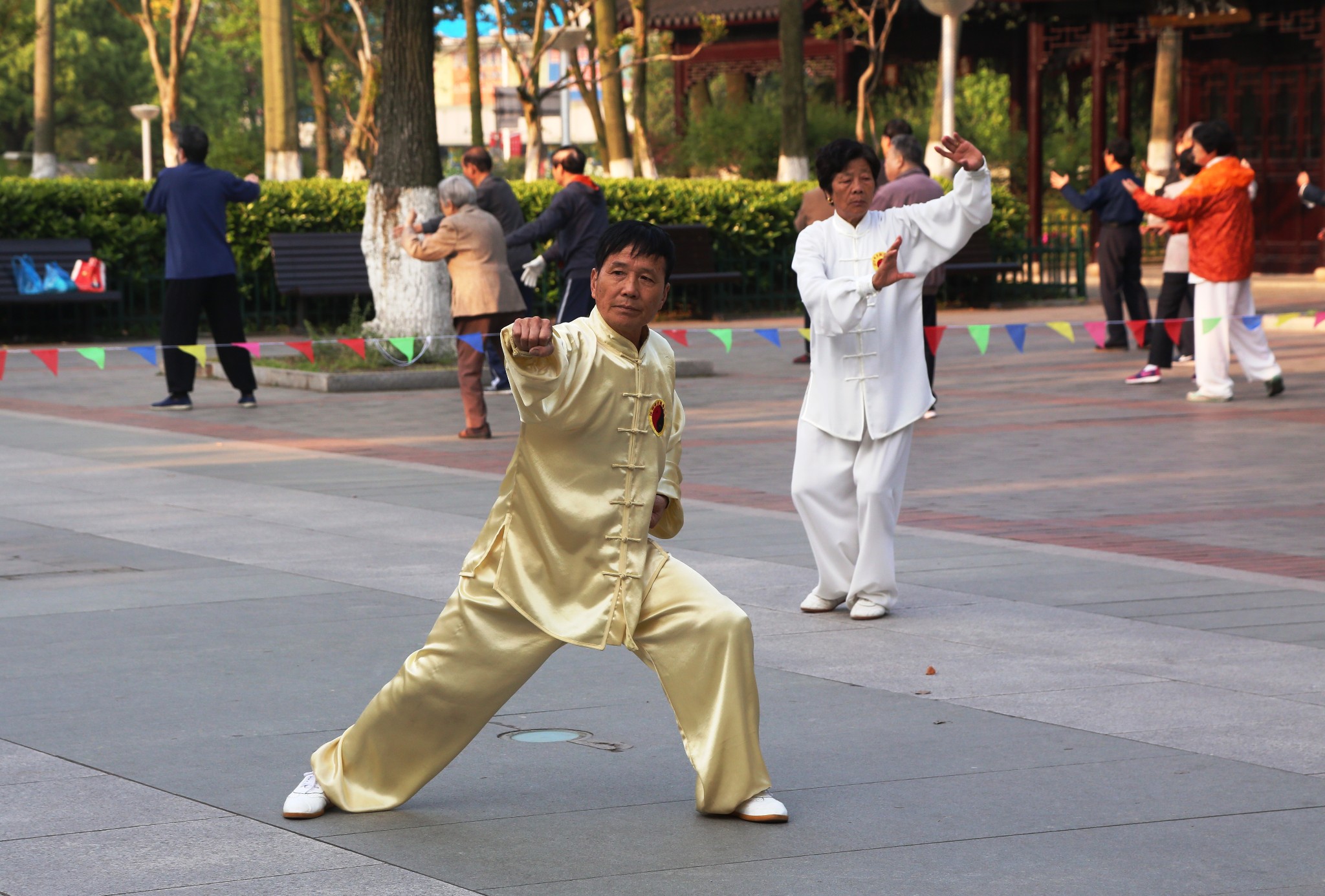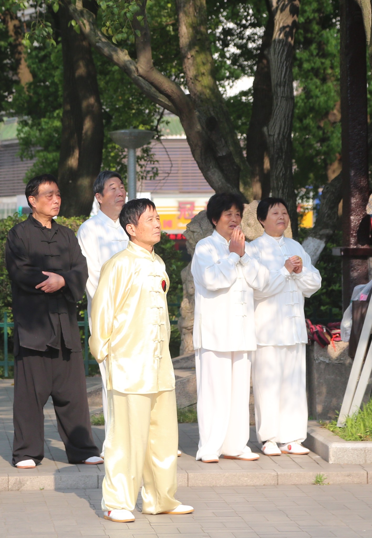 表演场地旁边没有参加表演的太极拳师傅们,正在聚精会神练习。