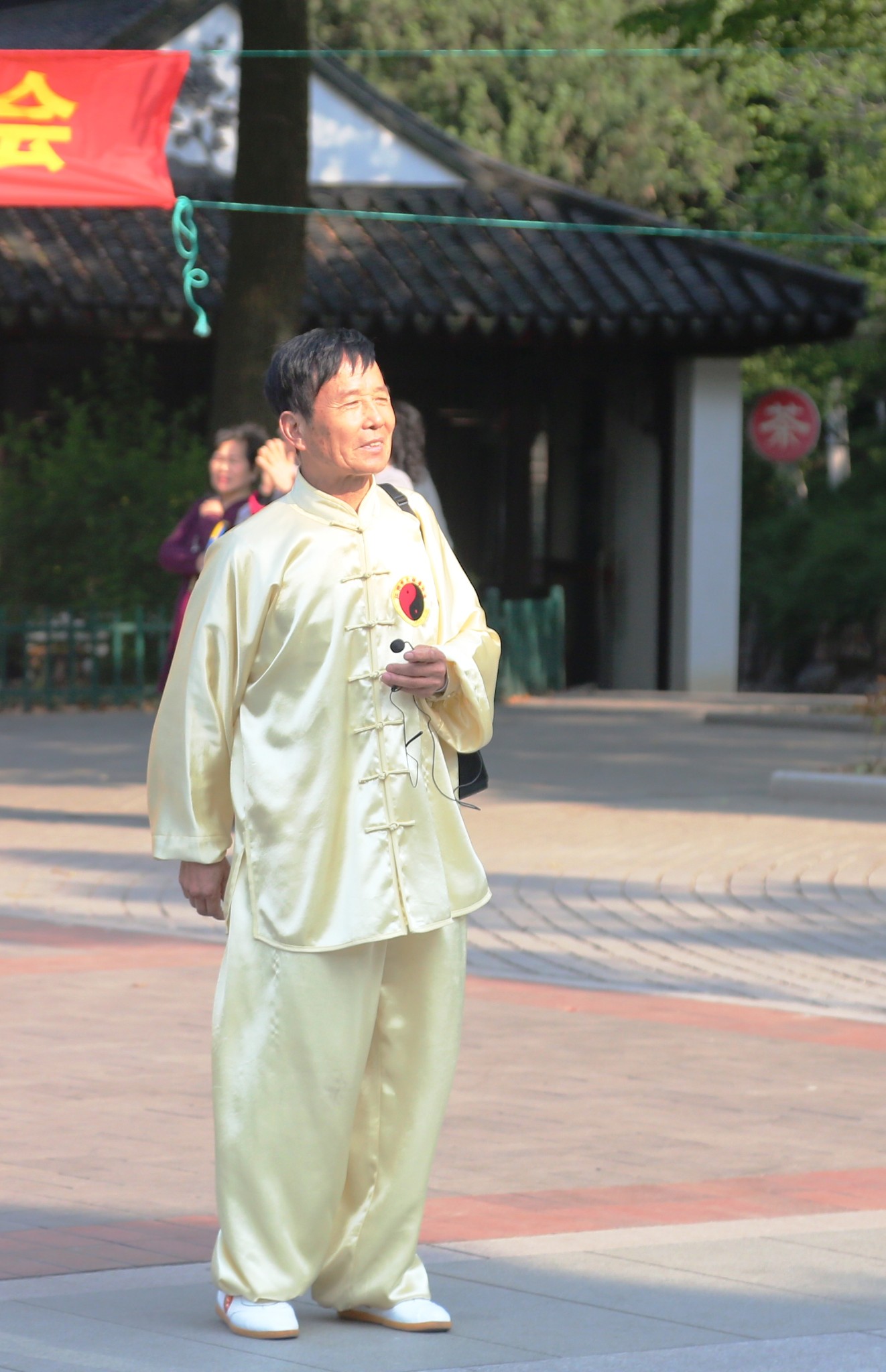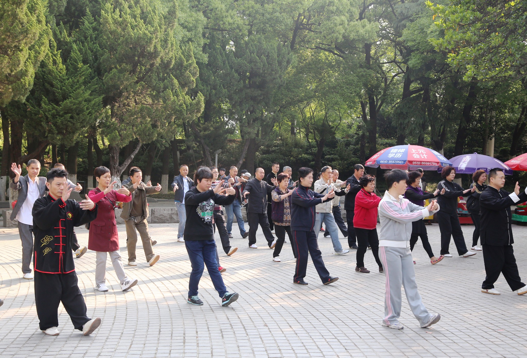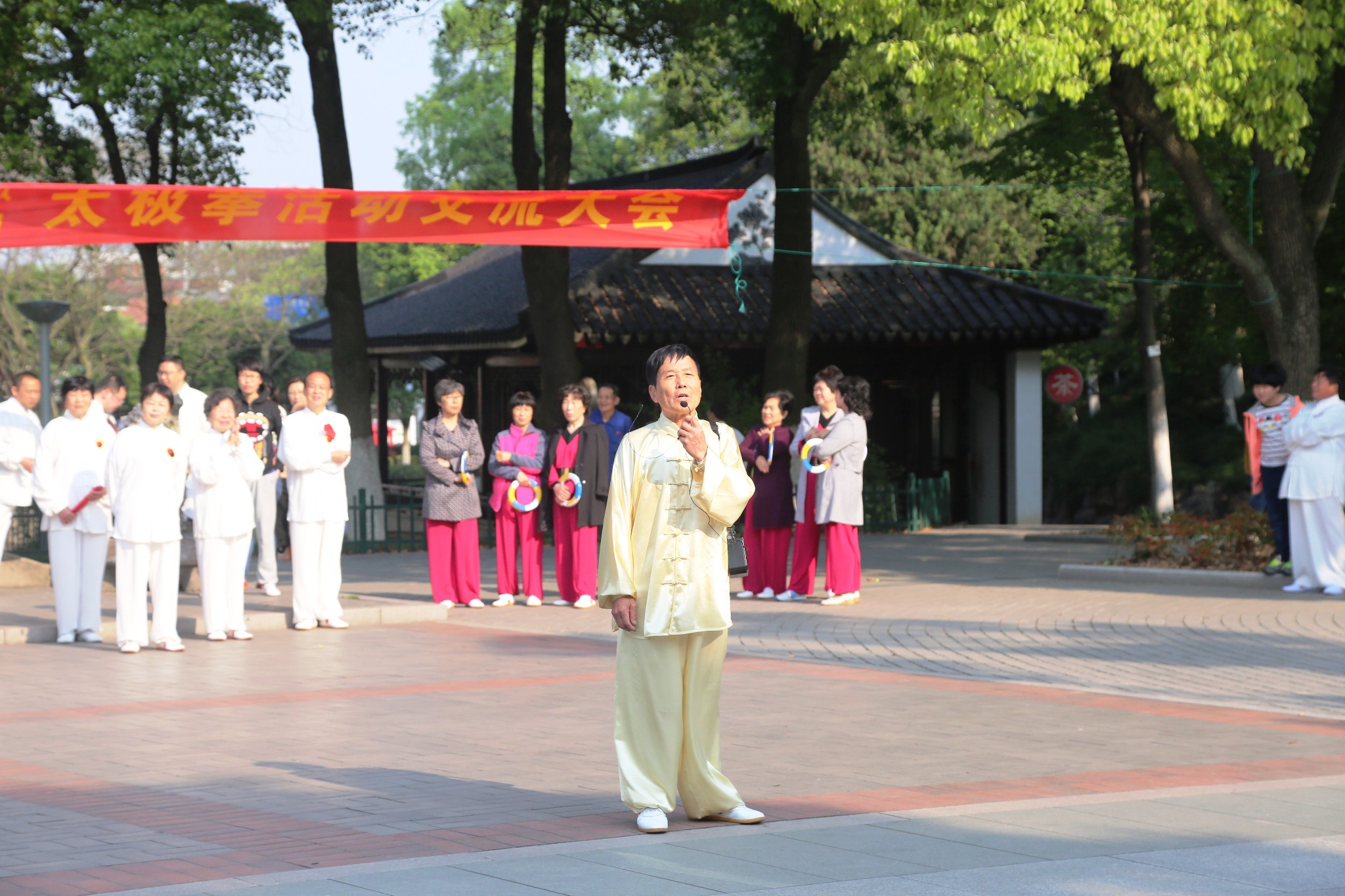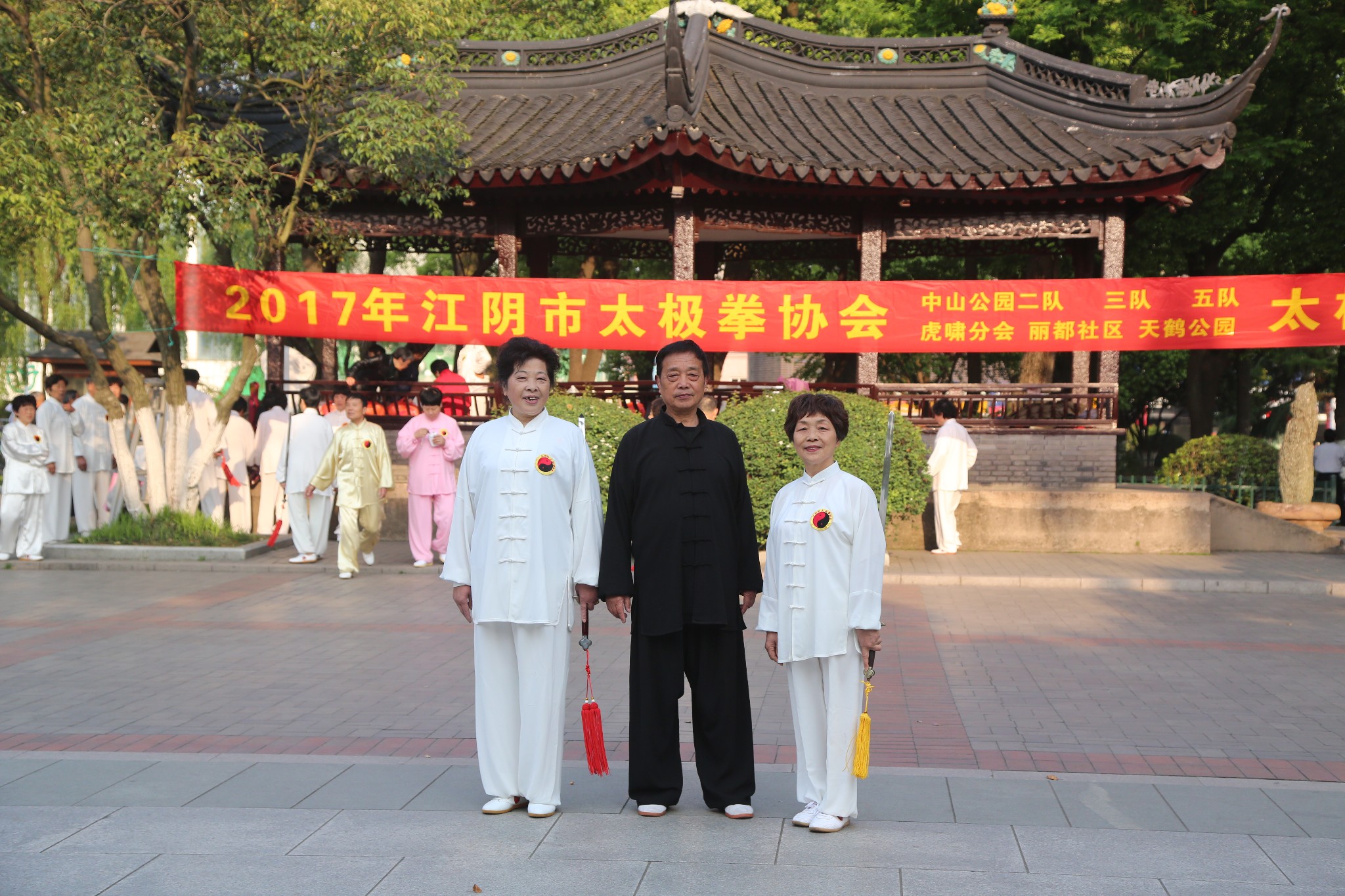 图片中穿黑色衣服的是中山公园二组原来的组长金士祥师傅,中山公园二组上百位太极拳爱好者在金师傅杨师傅等人的带领下,人员多多少少进进出出,义务教拳不收费,是不用考试,没有围墙的太极拳大学。只要你有兴趣,都是可以来学习。已经坚持锻炼十几年了,不管是刮风下雨还是严寒酷署,这支队伍一直没有散,有了江阴市太极拳协会后,参加交流学习的机会多了,小组组织管理更加正规。看到自己的徒弟和拳友们在自己的场地上成功举办这次活动,他悄悄地在一边发出由衷的微笑。