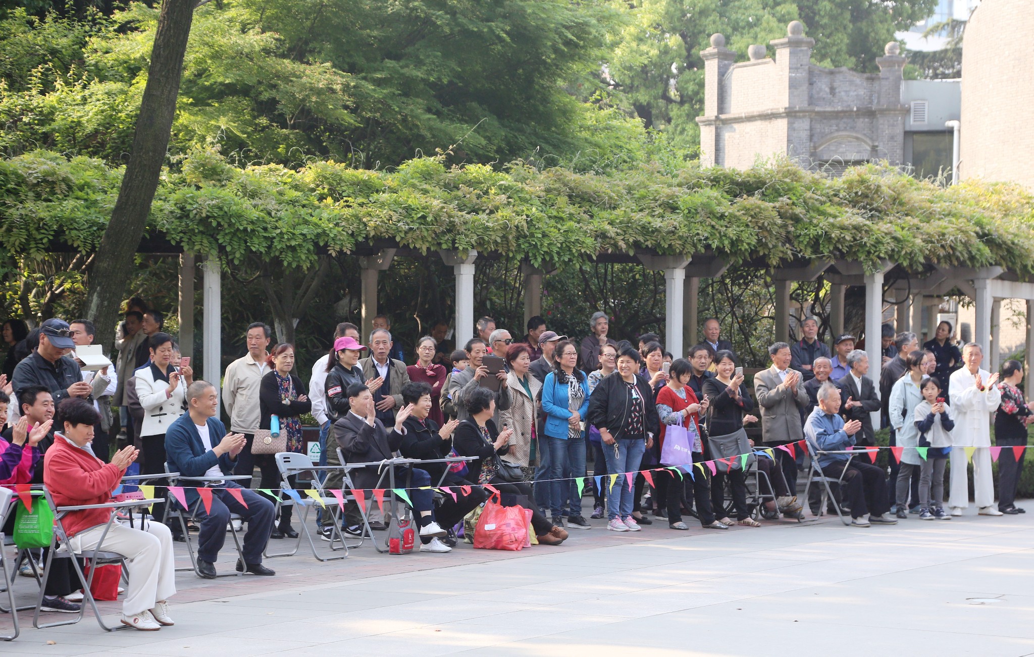 中山公园二组目前有会员83人。每天早上,他们在会长顾永兴的带领下,在紫藤花下,桐梓堂后、中山纪念塔广场前习练太极。下面几张就是利用表演之前的等待时间练习的图片。