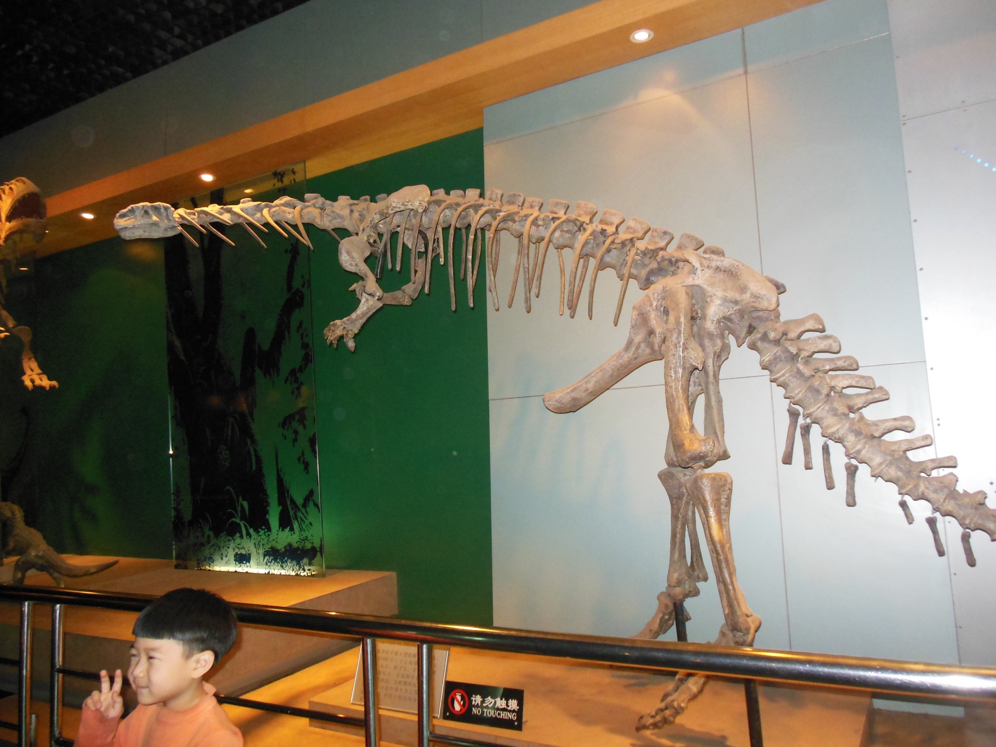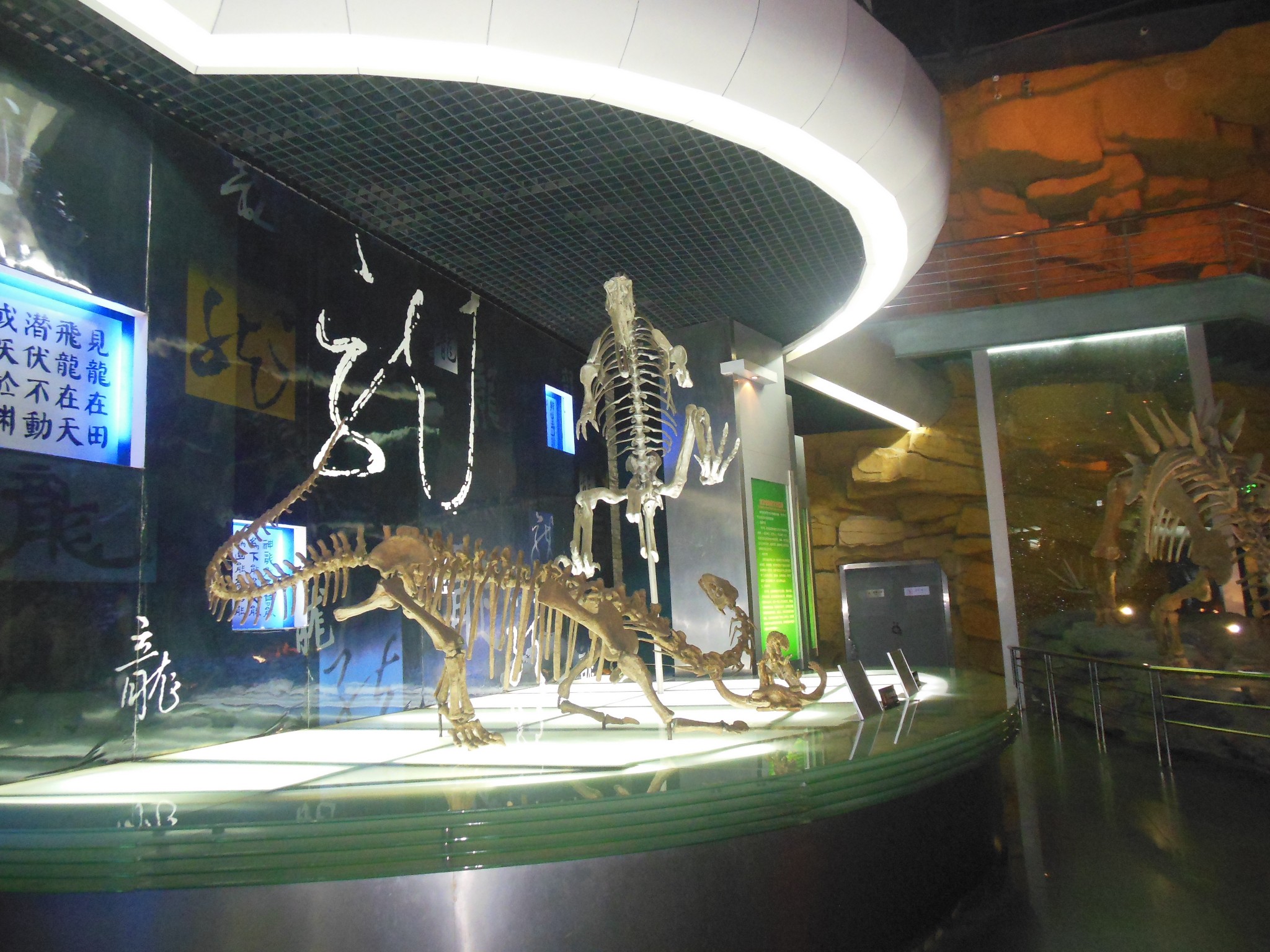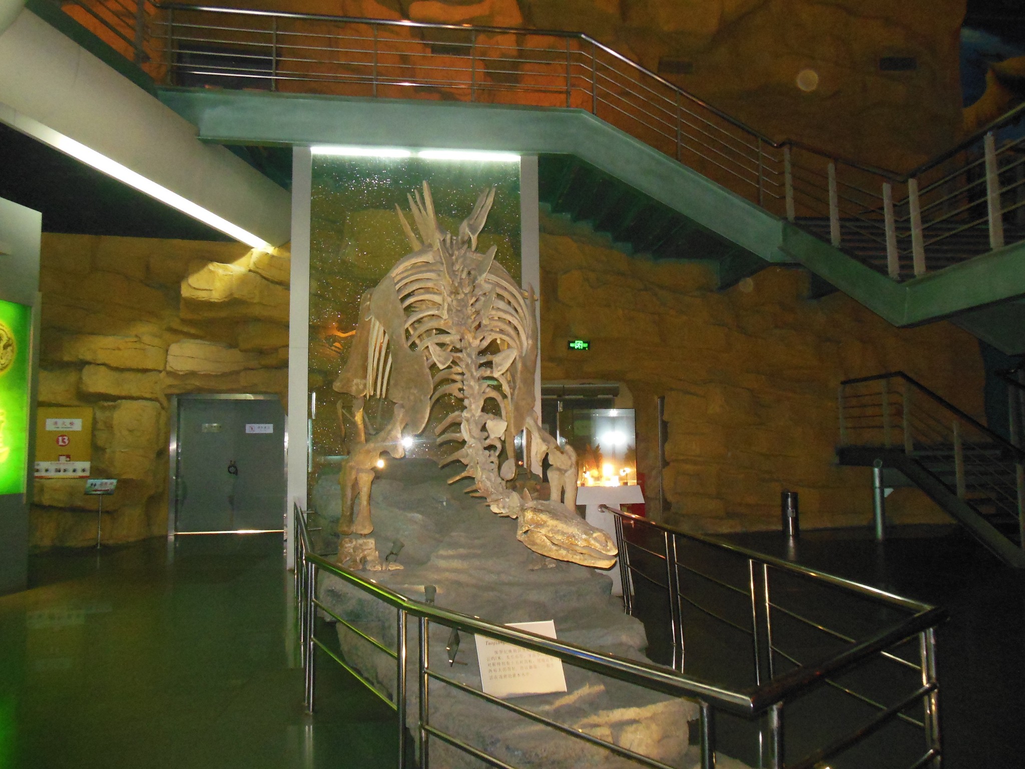 恐龙馆有上下3个陈列室,至少15具恐龙骨架,拍了几具,管理员让我把闪光灯关掉,说,闪光会损伤恐龙化石。