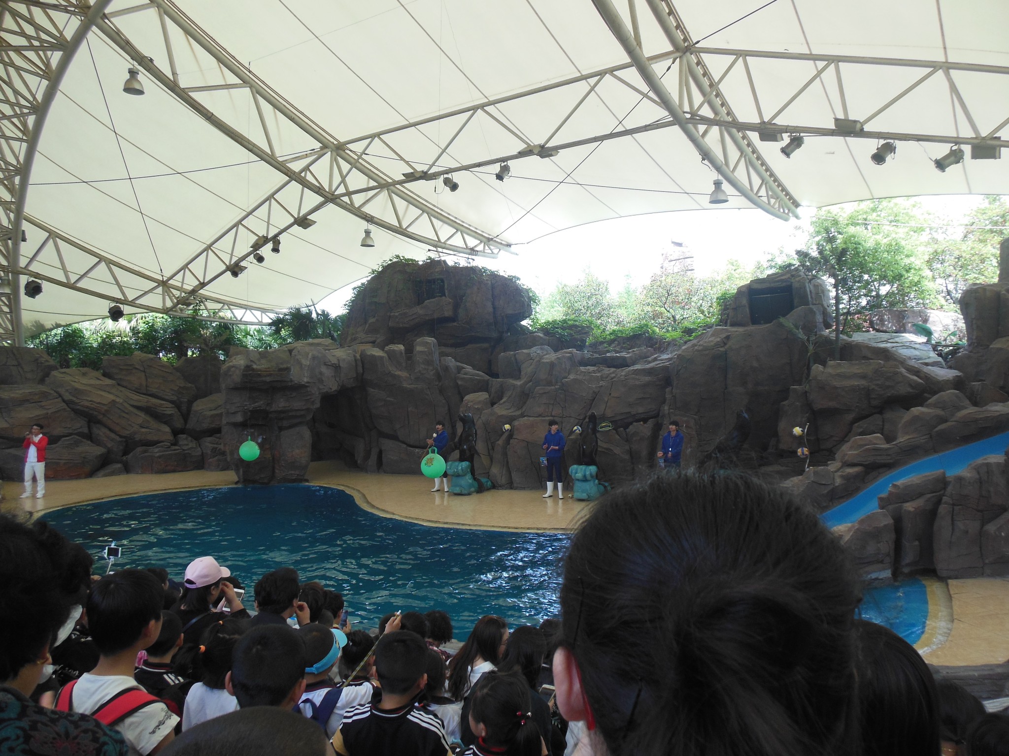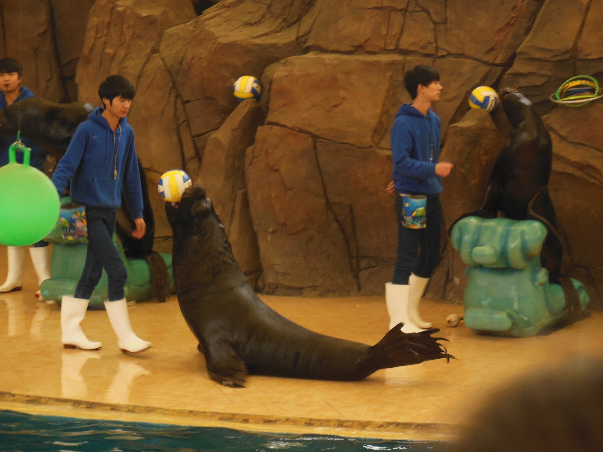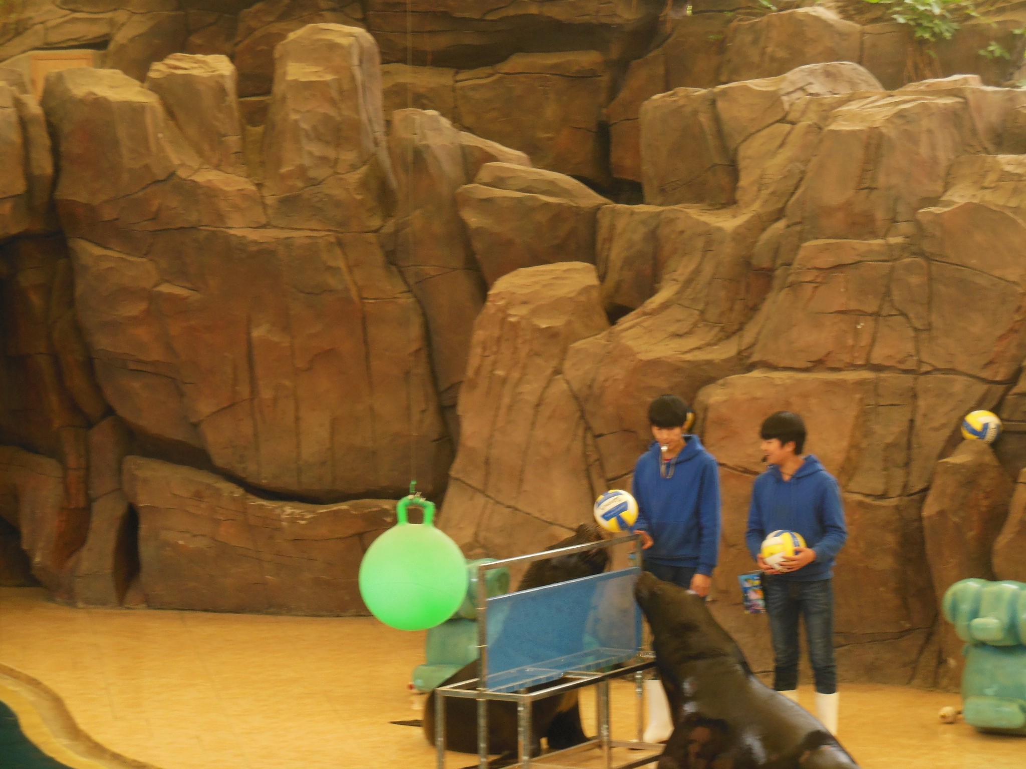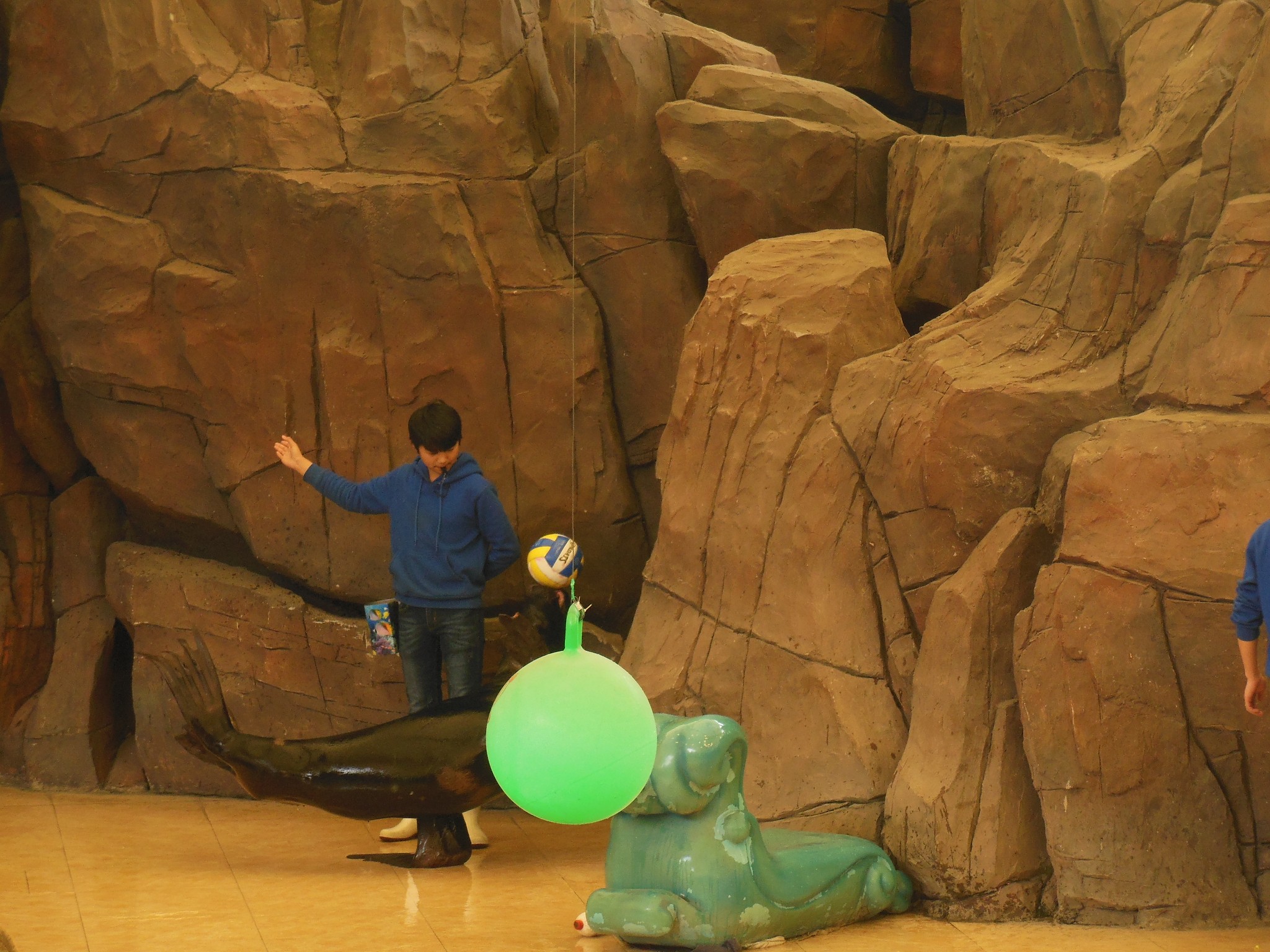 2只海狮打排球。接着一只海狮和人比赛投篮。海狮十投十中,而那位帅哥真丢尽了脸,一只球都没有投进去哦!