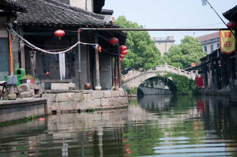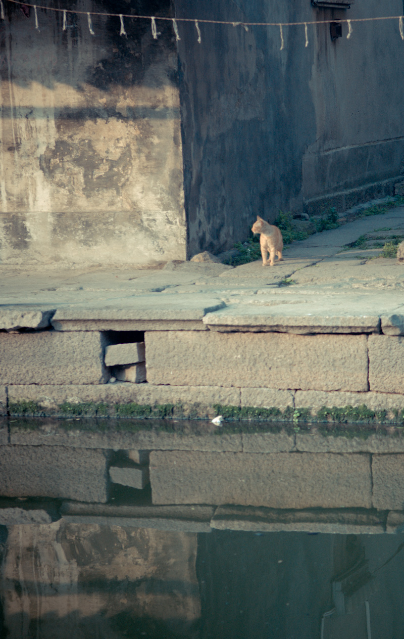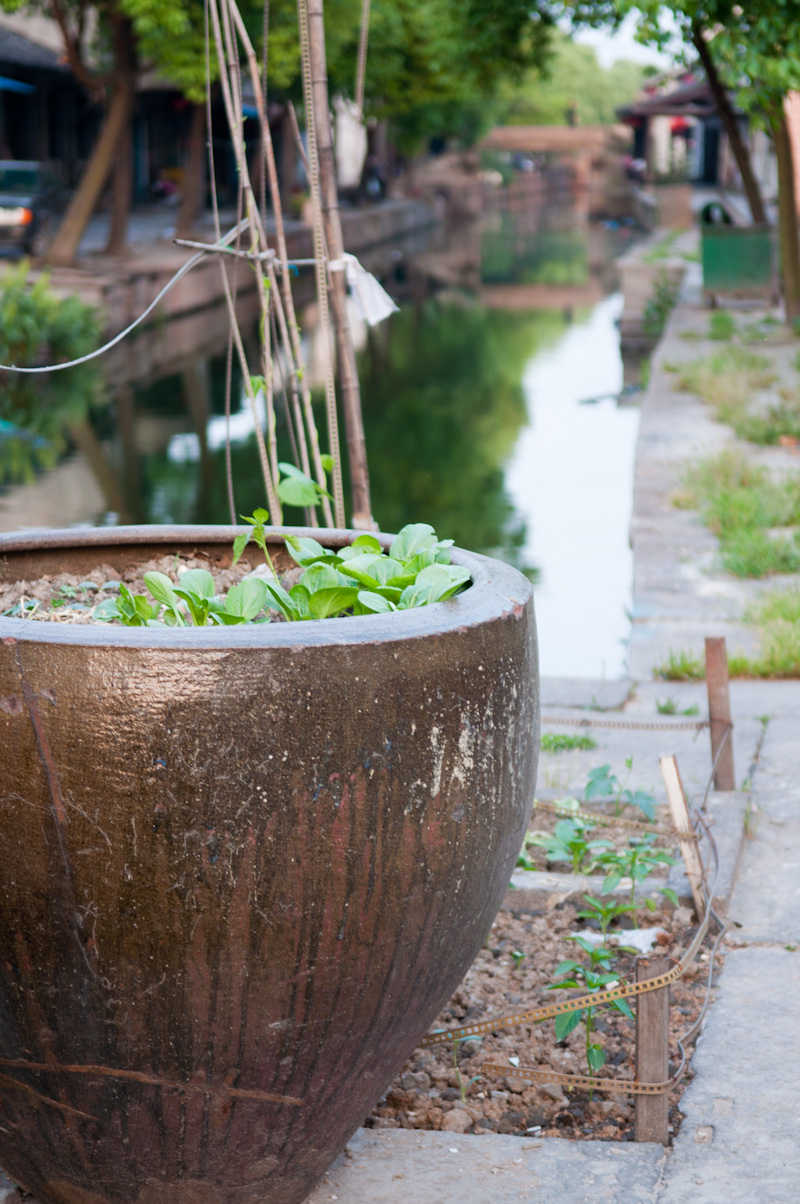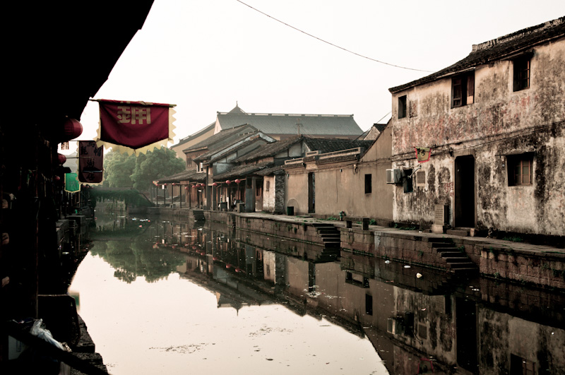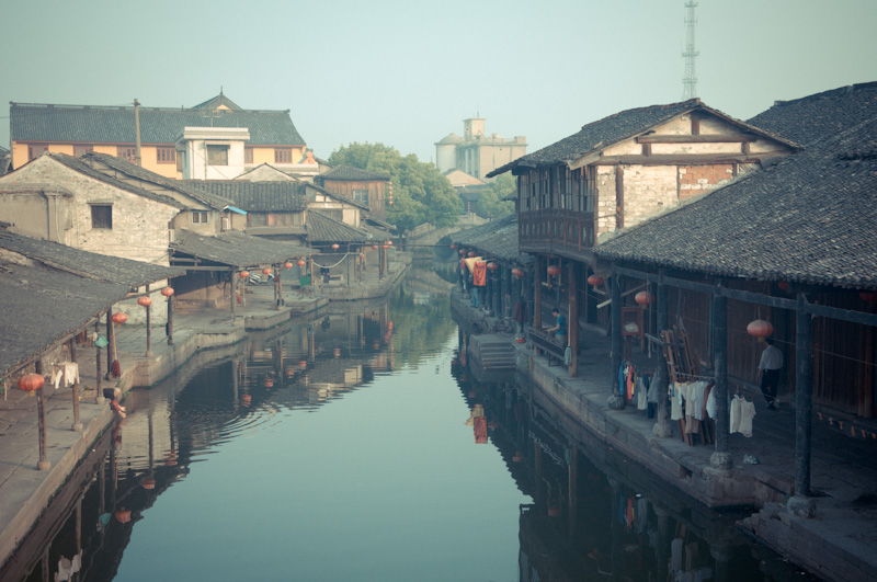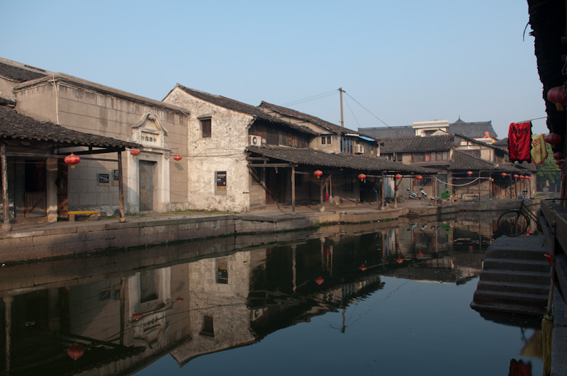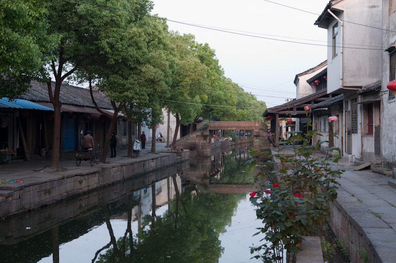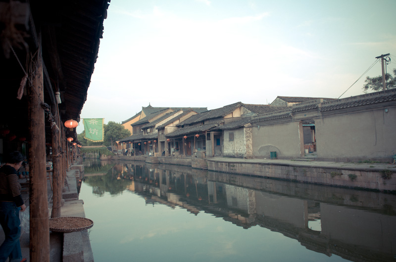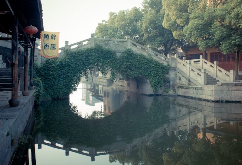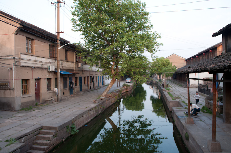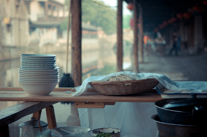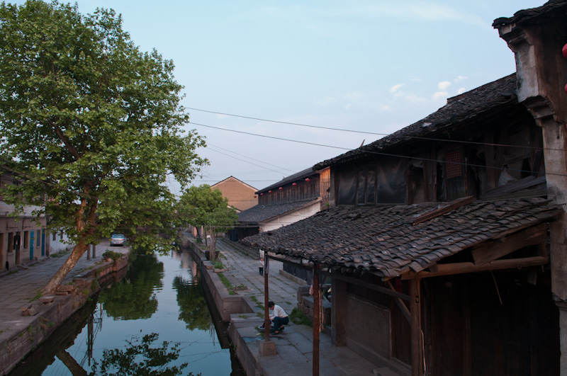 为了体验古镇的清晨,第二天我起得很早。六点多钟,旅馆的老板睡眼惺忪地给我开了门,我走在小镇的石板路上,两边的店铺大都没有开门,只有老爷爷老太太们,带着懒散的表情,不是提了尿壶在河边冲刷,就是拎着菜不紧不慢地往家里走。