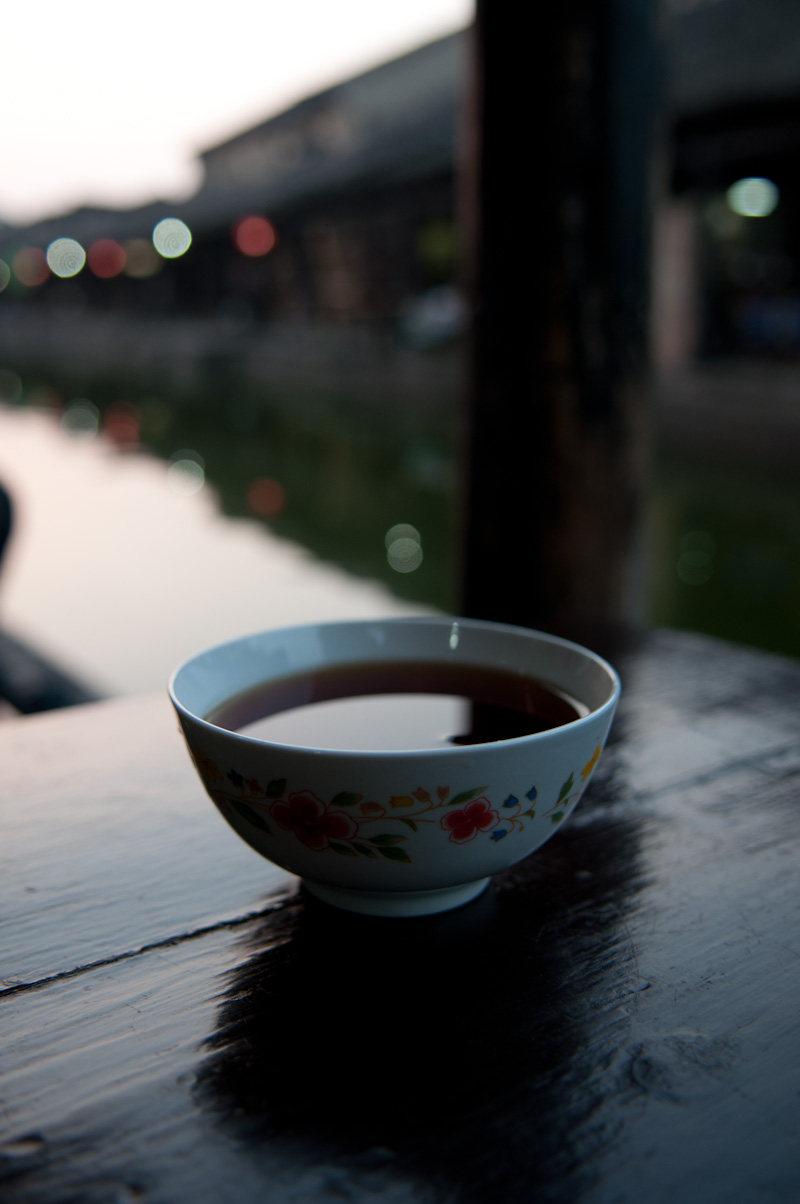 老板娘说的没错,待到七八点钟,小镇里就开始出现三三俩俩举着相机的游客,好奇地对着各处拍个不停。而此时的我,早已在镇上扫了一圈,安然地坐在河边的一家小茶馆里,写着我的游记。