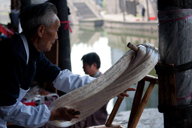 古镇上有一个老人(忘记名字),在手工制作拉糖 。所谓拉糖 ,是用白糖经过熬制,稍微冷却后再用手工反复拉制做成。
