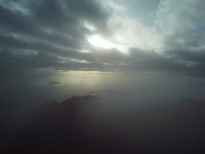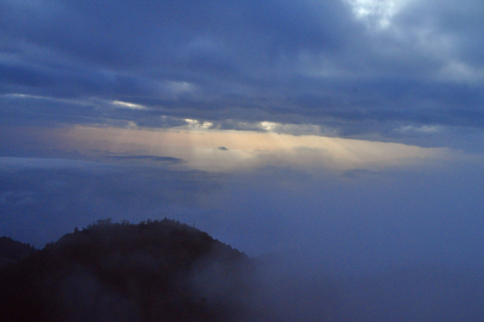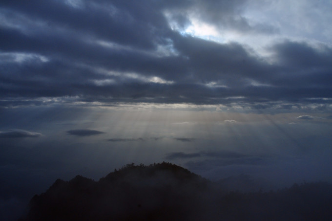 凌晨5点,我习惯性的开窗看下外面的天空,扑面而来的冷空气,让我禁不住打了一个寒颤。打开手电筒照外面,一片漆黑……不管怎样,期待日出的我是不能偷懒的,起早摸黑已经是习惯了。在一片伸手不见五指的黑暗中,我打着手电筒,走到牛背山的最高峰光明顶。寒风中,瑟瑟发抖,真的很冷,还好戴了手套,不然我真担心手会被冻掉。