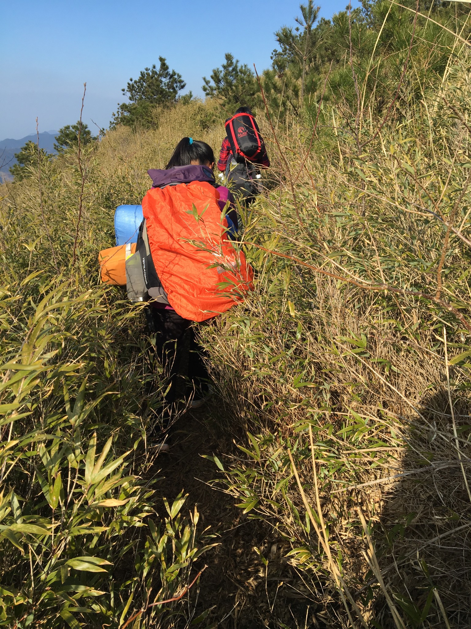 【徒步路线】:华浪线登山口(1340m)——太子尖(1559m)——上马啸(1200m)——中马啸(1449m)——花石岗(1485m)——下马啸(1152m)——绝望坡——百丈岭林场(宿营地,1334m)——大牛粪(1598m)——童公尖(1558m)——浮桥村(800m)。
