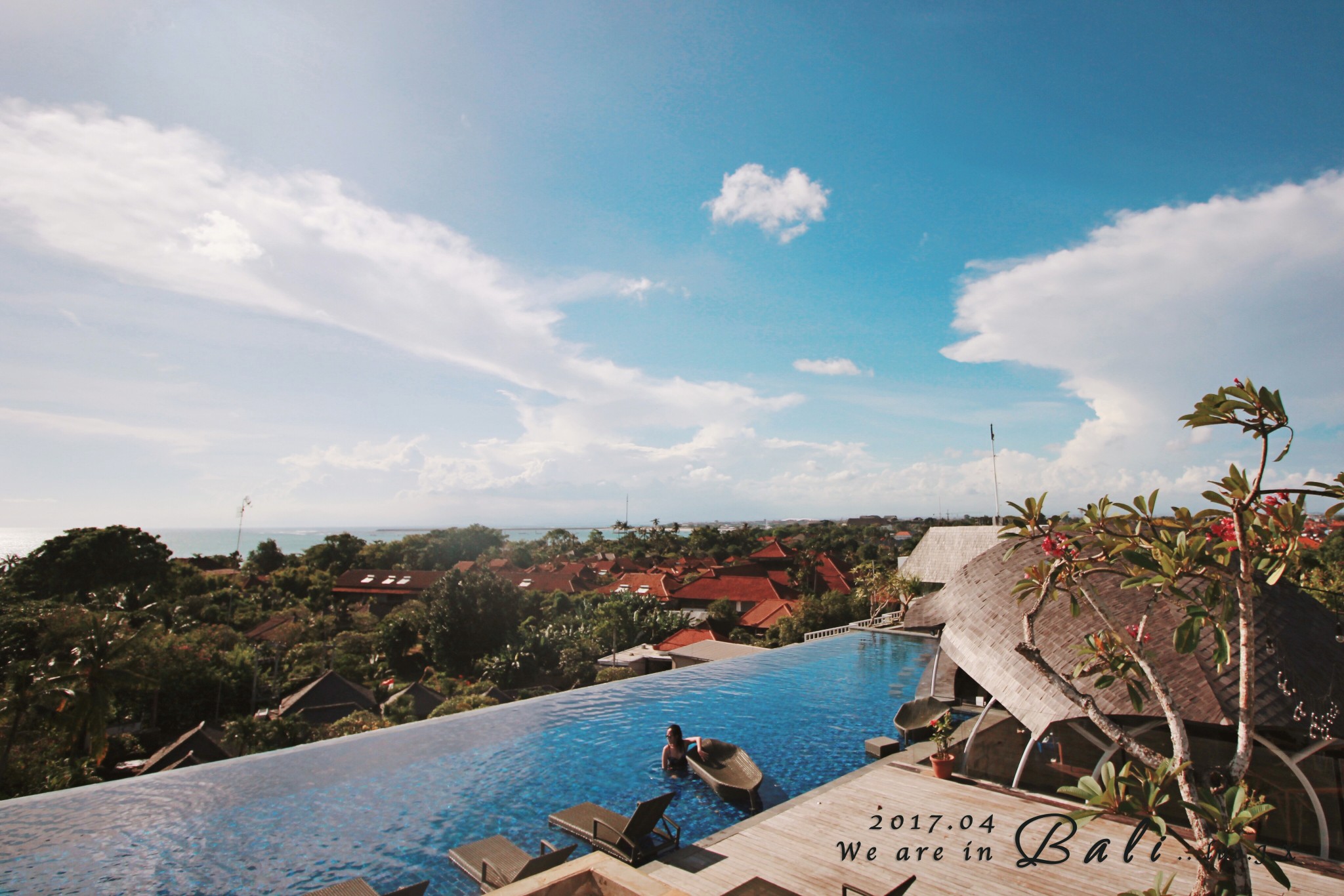 酒店顶楼的无边际泳池,蓝色的一片,远望落日余晖中的金巴兰海滩,泳池、天空、海洋浑然一体。