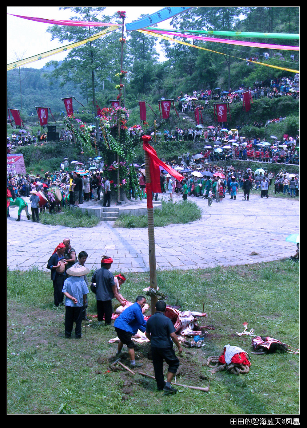 牛。届时,在宽坪中竖一根涂以五彩的龙凤花柱,以麻绳穿牛鼻,系上蔑圈套于花柱