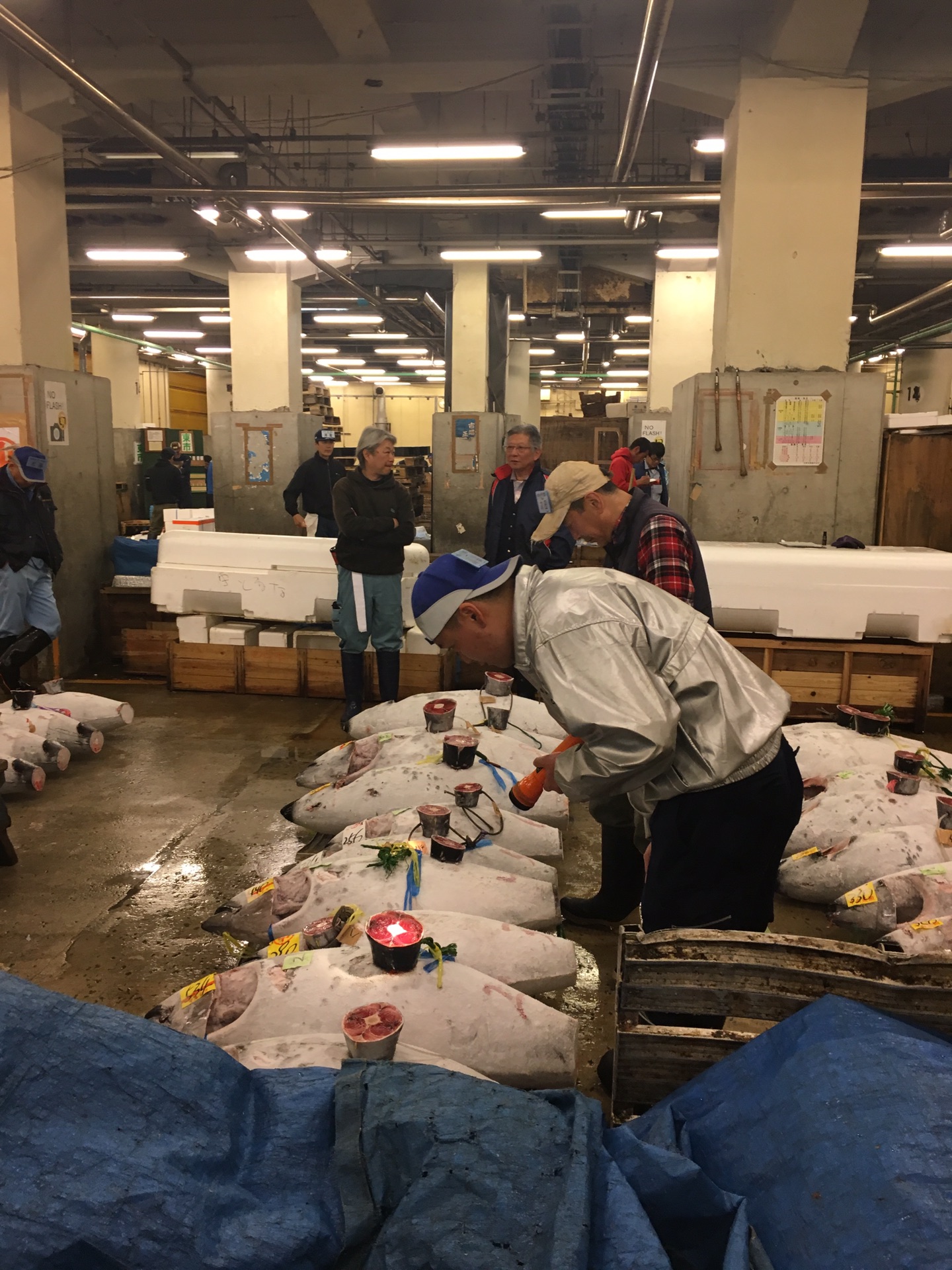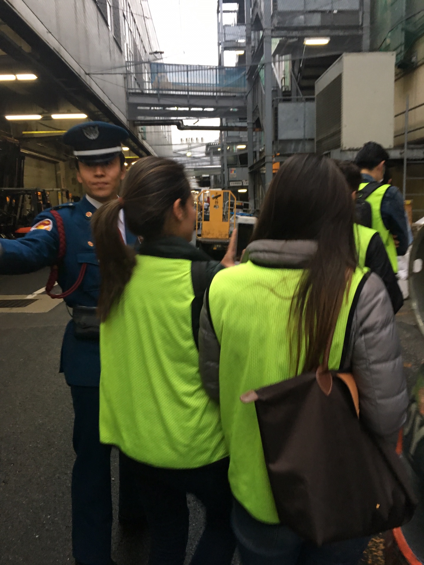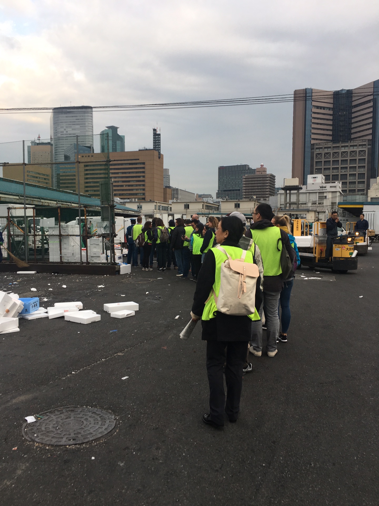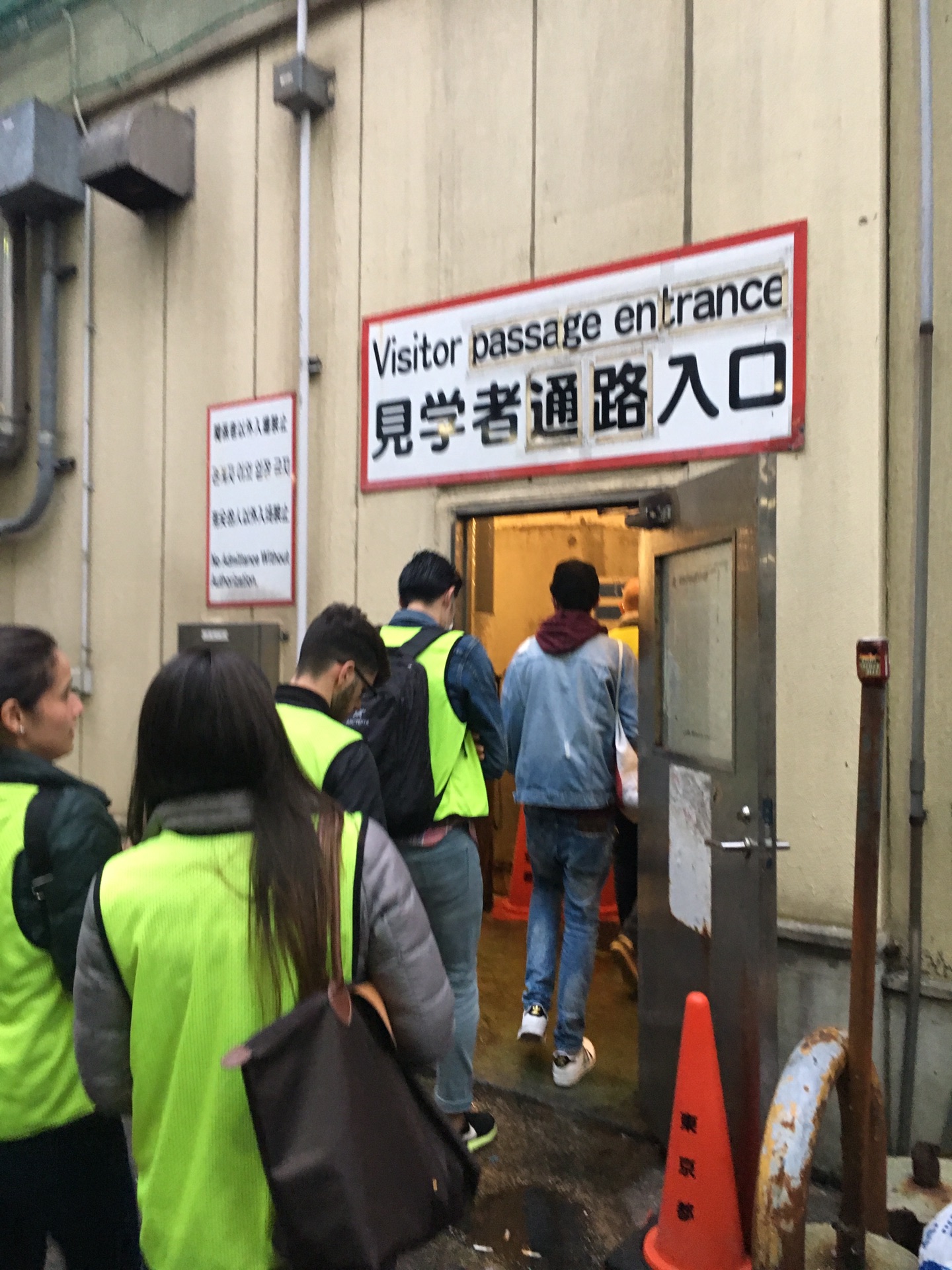 因为看别人的游记里提到去筑地看金枪鱼拍卖每天只有120人的限额,所以大概要凌晨3点去排队~下了车看了眼表,差20分钟3点~摸不清方向,心里特别紧张~还好凌晨的筑地有小铺开着,问了路很快找到了地方~那时候已经很多人在排队了~站在我们前面有几个围着头巾的境外女孩,跟灰头巾确定了一下是看拍卖的心里才踏实~