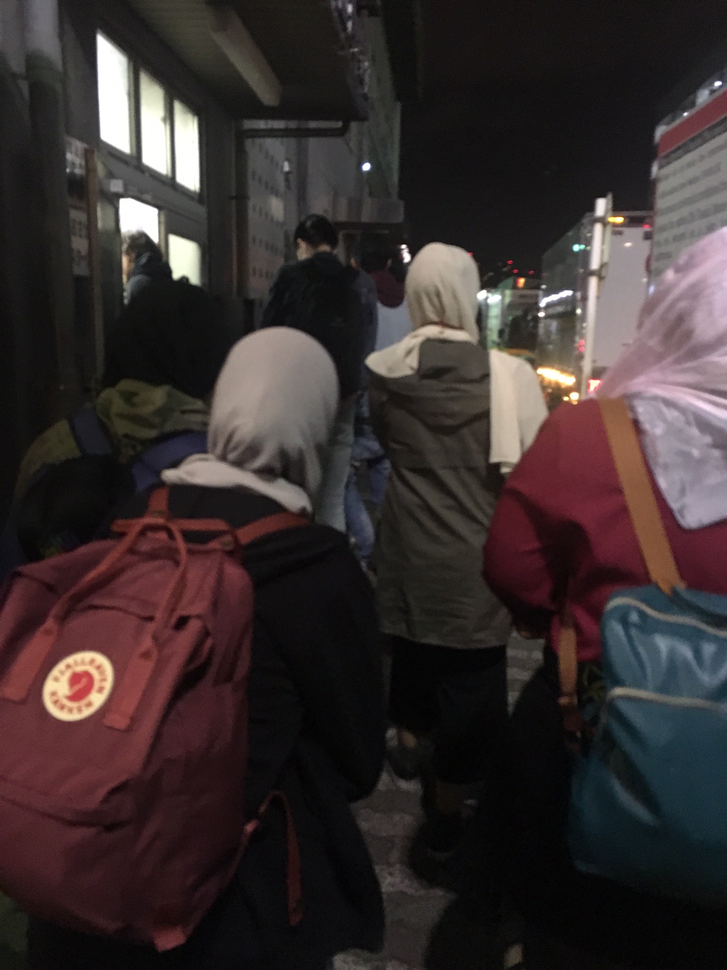 因为兴奋,一路聊都不觉得累~拿了行李入了关就已经是什么地铁也没有了,只有大巴~我们订的房在高田马场,没有直接到的大巴,只能坐到新宿再打车~因为这次的行程中有去筑地市场看金枪鱼拍卖,所以让机场服务人员帮忙查询了从机场到筑地市场的车,很遗憾,这个时间只有出租~大家都知道东京的出 租车 特别贵,服务人员跟我们说价格的时候自己都被吓了一跳,跟无奈的笑着说大概要8000块~