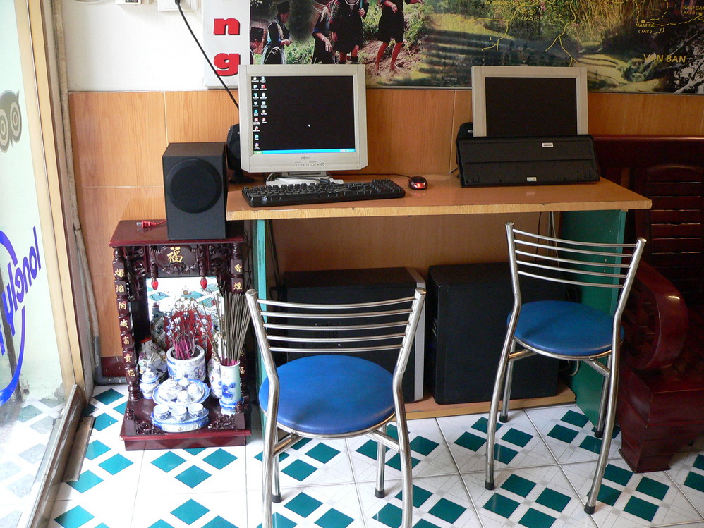 大堂有两台电脑提供住客上网。角落有个神龛,写着汉字。当地的商铺都有的特色,可见汉文化的影响。