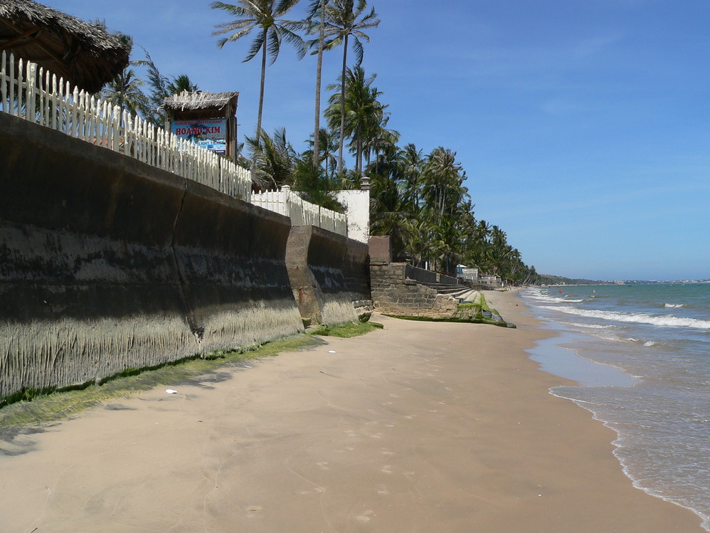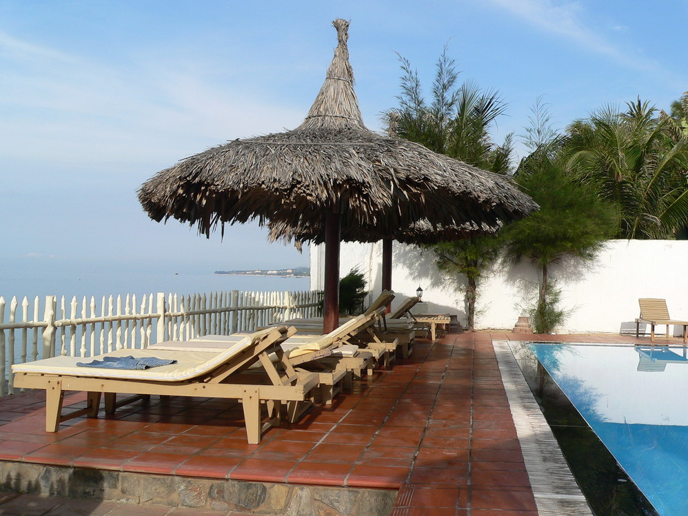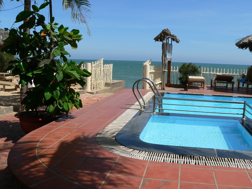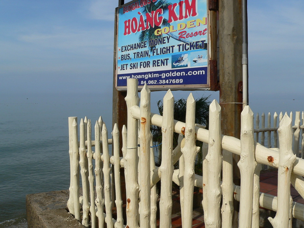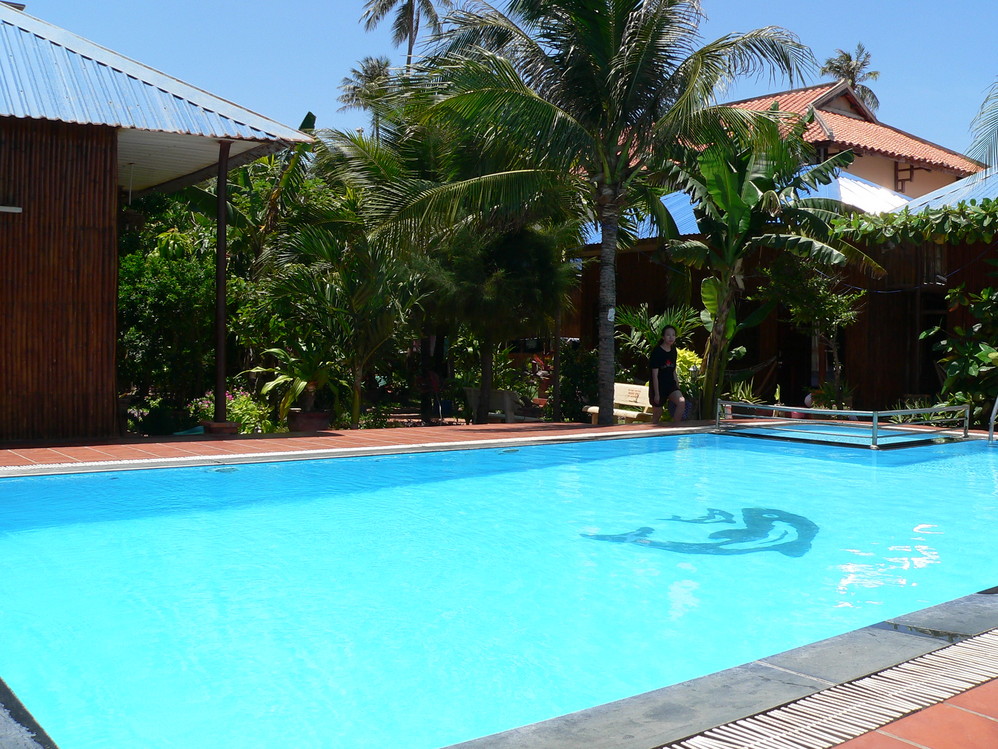 第三、四晚我们住在美奈 中区的HOANG KIM GOLDEN RESORT (地址:140 NGUYEN DINH CHIEU ST.-HAM TIEN WARD-PHAN THIET CITY-VN;邮箱:mailto:info@hoangkim-golden.com(info@hoangkim-golden.com) )。巴士从美奈 高档酒店林立的西区经过,驶入中区,停在Hoang Kim前面。下车。进入大堂。一看——哗!不禁一声惊呼。这正是我们想要的酒店,人生旅途中值得停下来休憩一两天的小站,路上的疲惫和两天来忧心忡忡在心中留下的阴影一扫而光。只见庭院中林木茂盛,曲径通幽,两边的木屋小筑古朴婉约。泳池那一汪蓝啊,让人“恨”死。无际的绿色大海近在咫尺,由泳池步下几级台阶便可跃入海中。没有西区豪华酒店的水晶吊灯和按摩浴缸,没有毕恭毕敬的侍者和循规蹈矩的绅士淑女。在这里,你可以赤足漫步,坦腹而卧;披头散发,素颜裸面。一个鸟语花香中休养身心的好地方。在这里住的第一晚62刀,第二晚45刀。