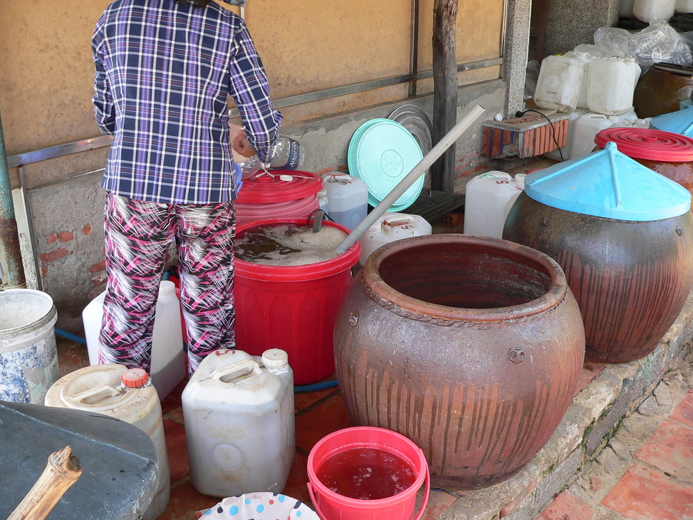 渔村里有许多大大小小的鱼露加工厂,空气中弥漫着鱼露的气味,一家作坊在灌装鱼露。