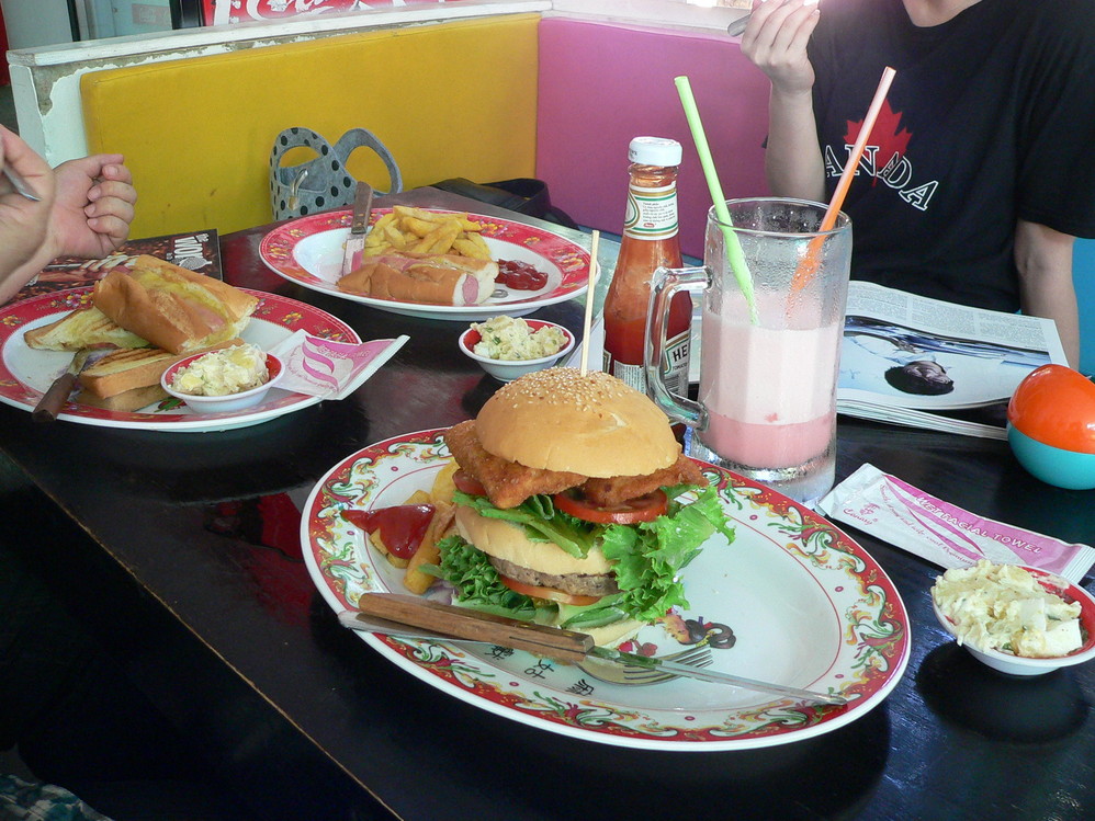 美奈 中区的PHAT HAMBURGERS“是唯一能从西区吸引客人前来的中区餐厅”,草莓奶昔超大杯,汉堡 包超巨型,并且美味。特对那些大碗喝酒大口吃肉,快意恩仇的好汉(如果还没绝种的话)的脾胃。