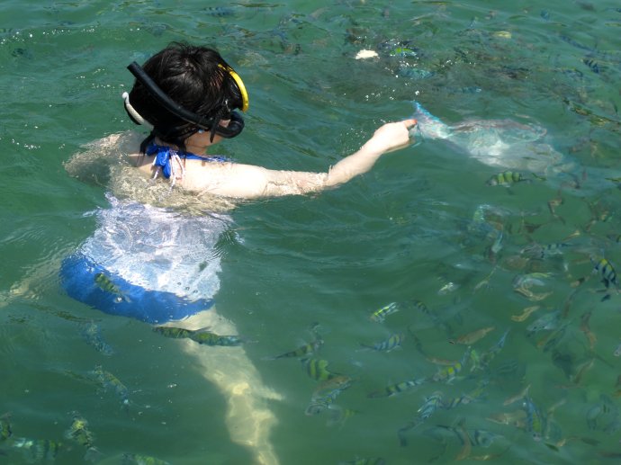 看到了吗?看到了吗? 那条彩色的大鱼, 蓝色粉边的!!!就在我的手边。。。。旁边还围着很多像尼莫一样的鱼。。。