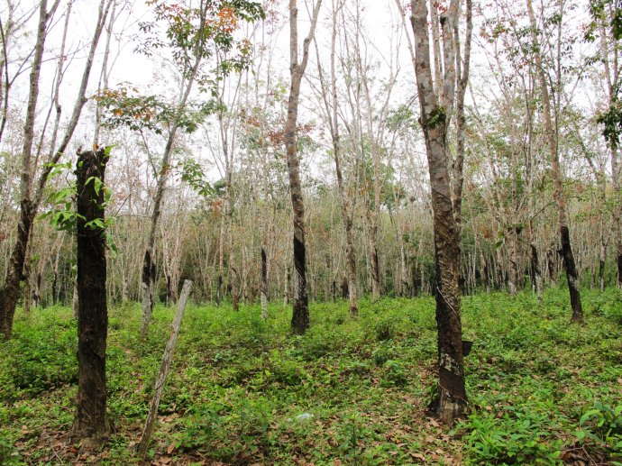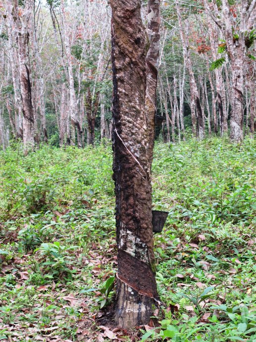 这就是橡胶树,树身被拉了一圈圈的划痕,最底端接了一个小桶,这样树胶就可以自己流到里面,一定时候就可以来收了,之后再送到加工厂就变成了生活中用的橡胶。
