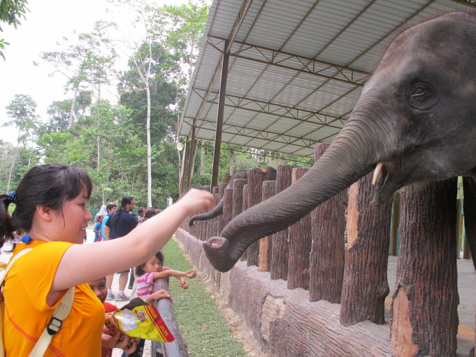 开始不敢把手直接伸给大象,只敢这样往里放。后来把花生放在手心里让大家自己来拿,很痒,大象的鼻子上有毛,而且出着热气,就像人的两个手指一下就把花生拿走了。。。很有意思。而且大象很聪明,它一旦发现袋子里没有吃的了,马上就不理你了,走开去别人那里了。。。哈哈