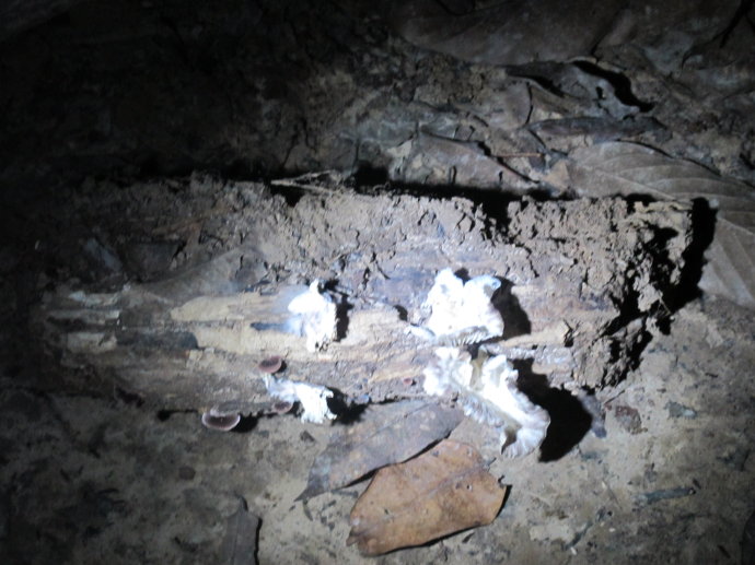 这个看似普通的蘑菇,其实是夜光的。。。当大家把手电关闭的时候,它就亮起了蓝光。。神奇!