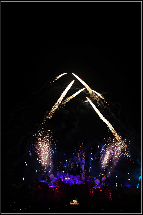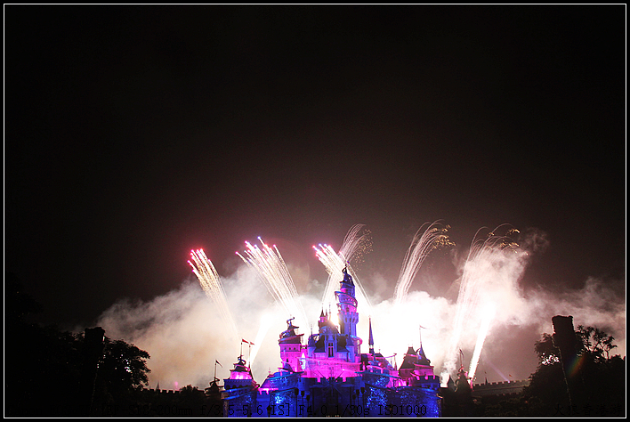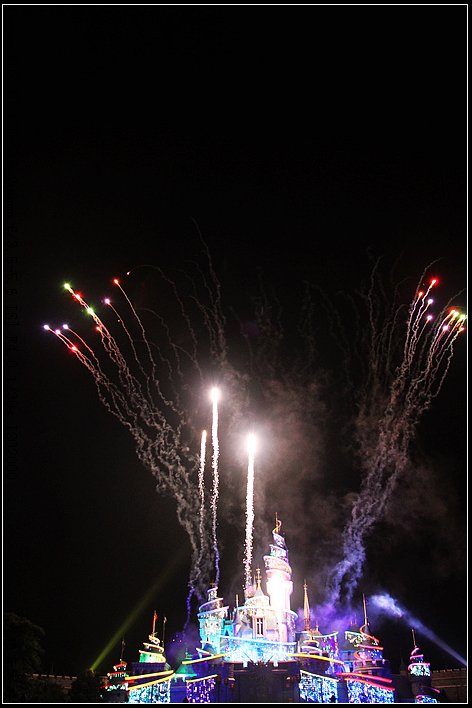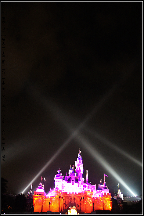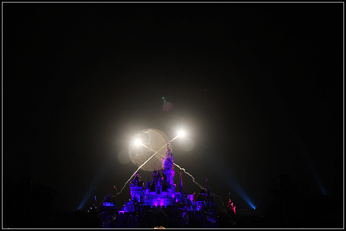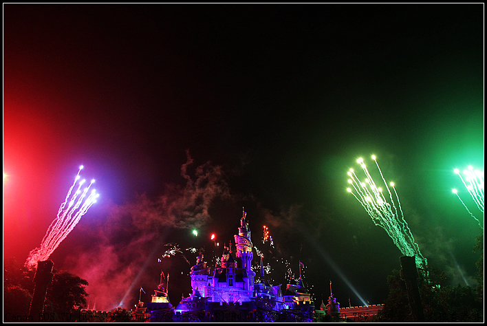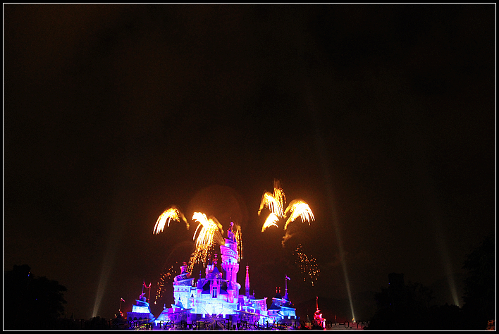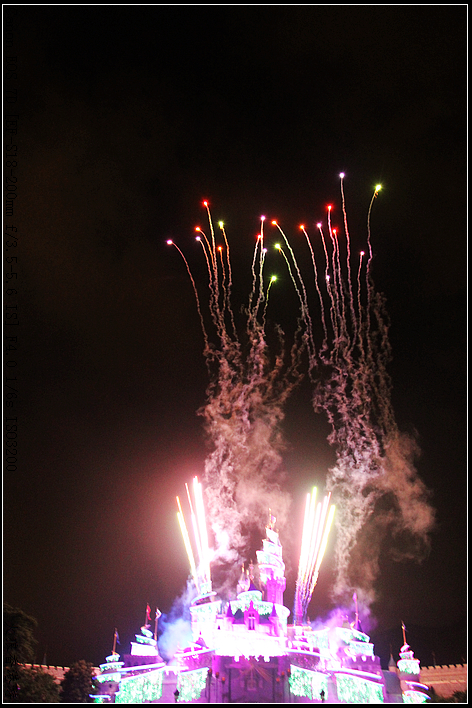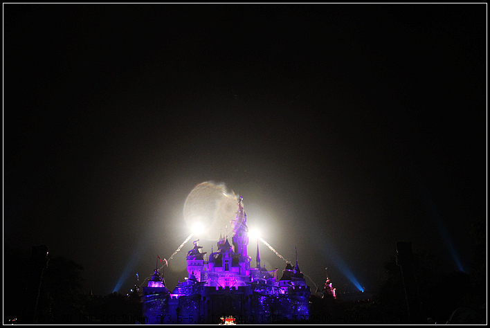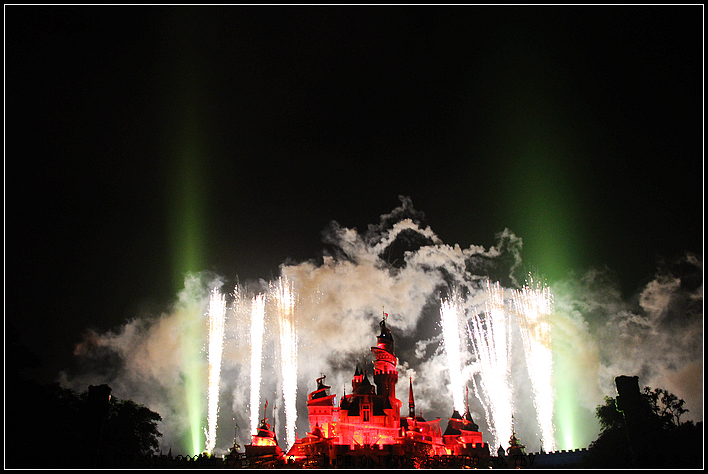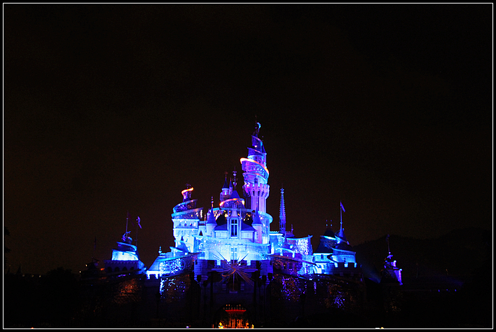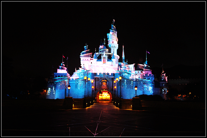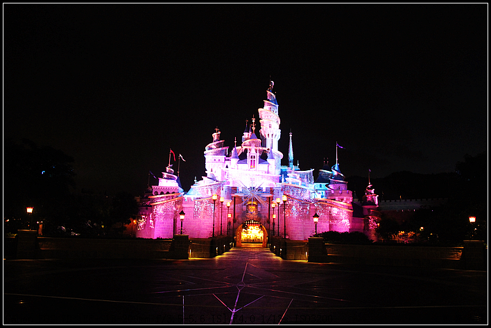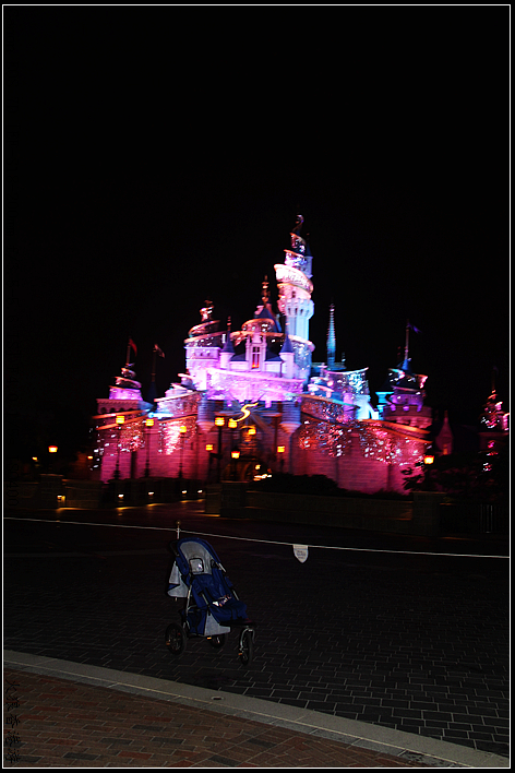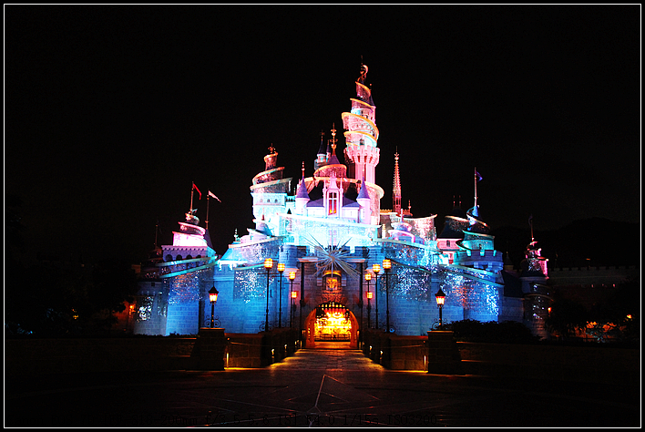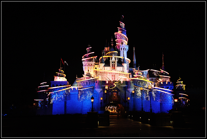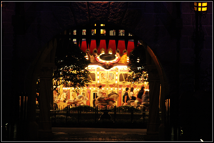 城堡入口正好直对着旋转木马。。演出开始时,木马也停止转动了。。