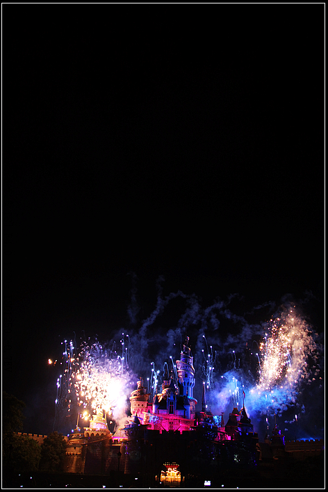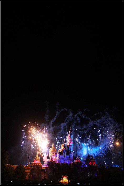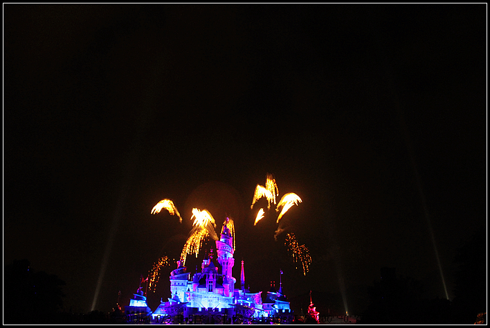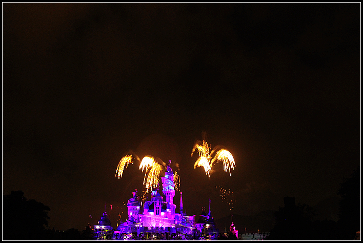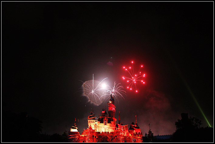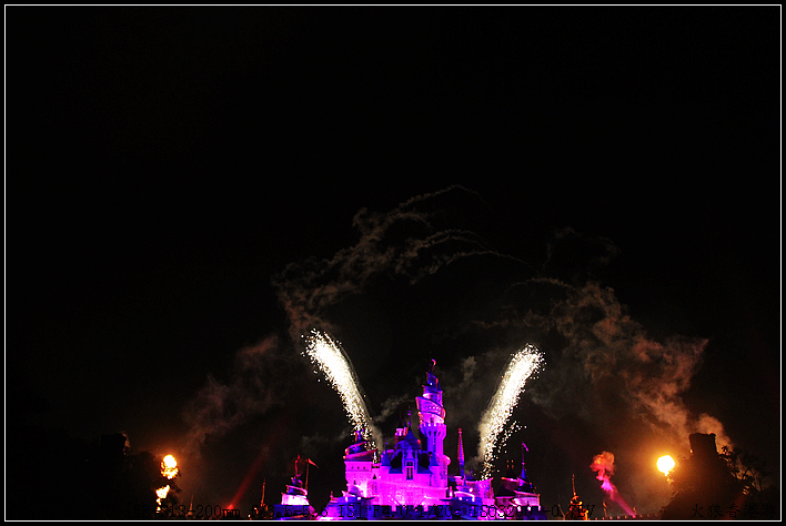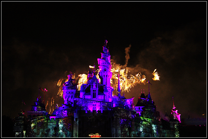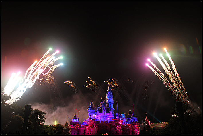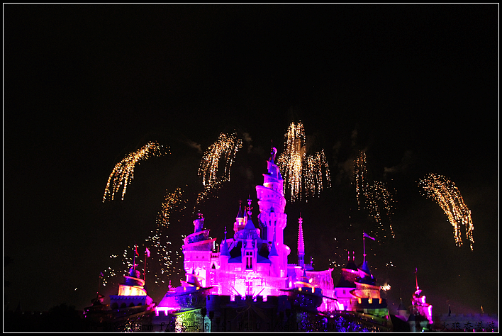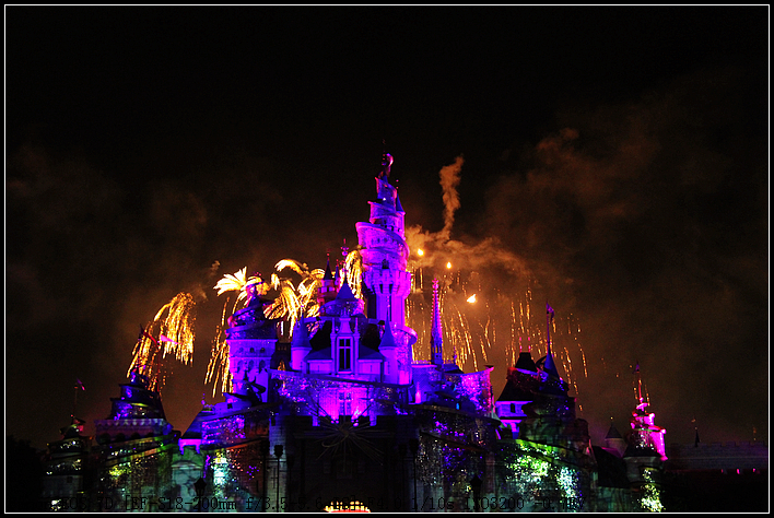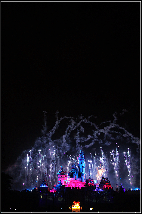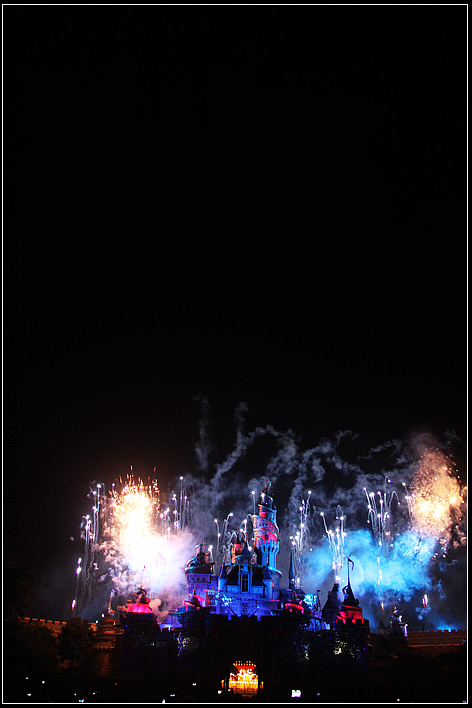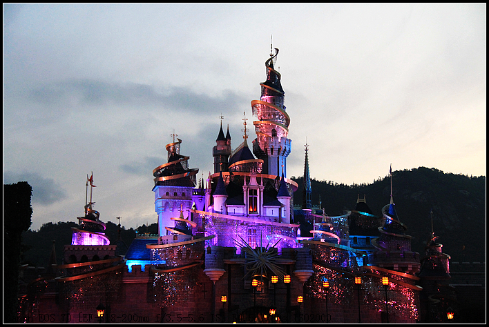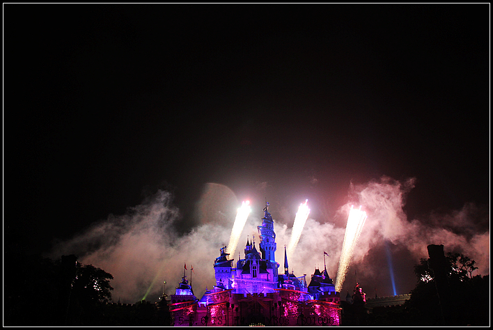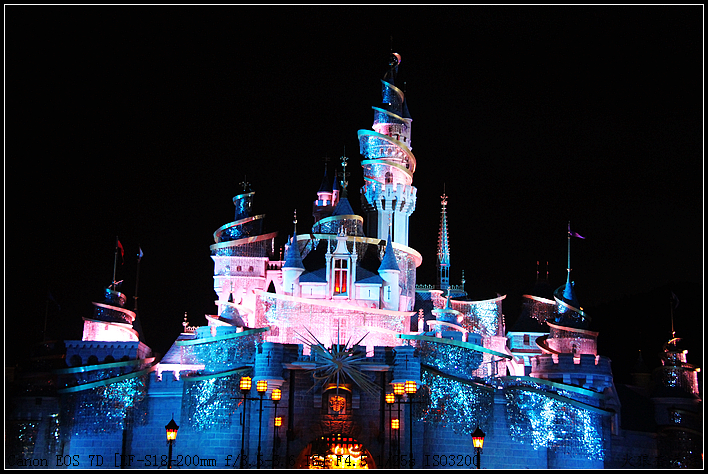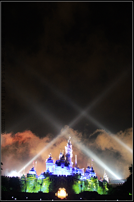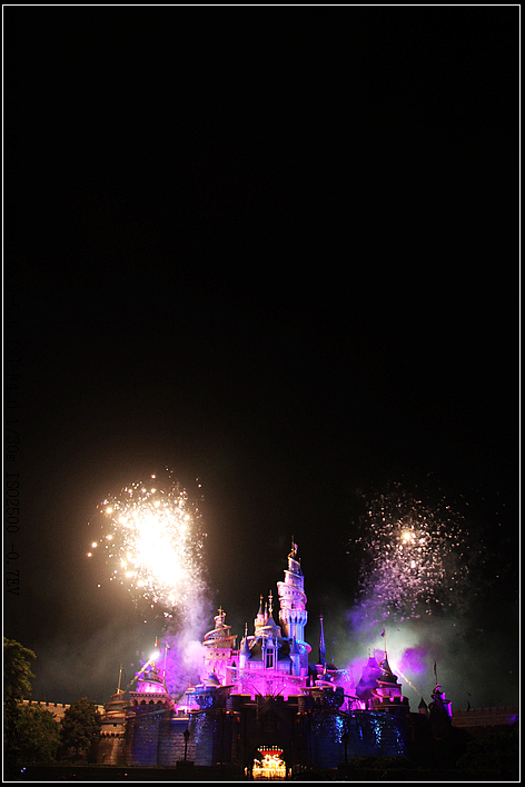 城堡入口正好直对着旋转木马。。演出开始时,木马也停止转动了。。