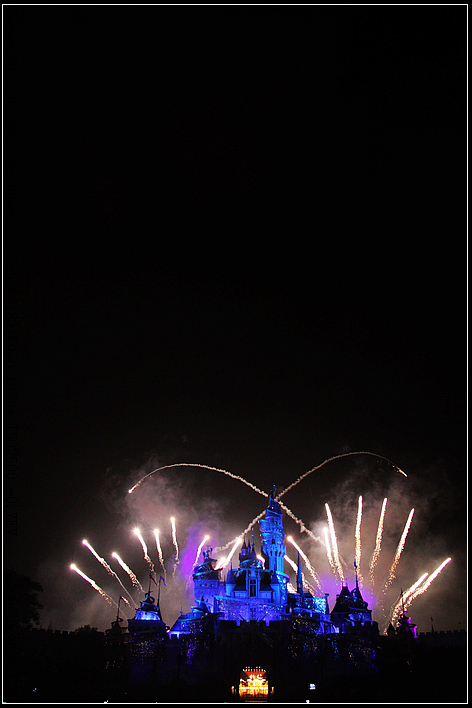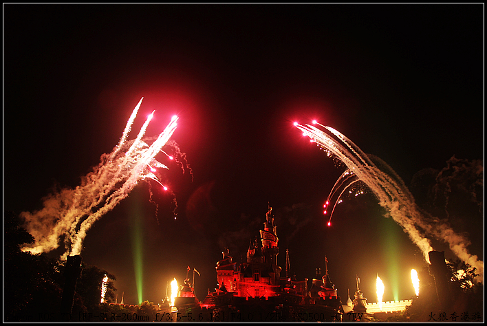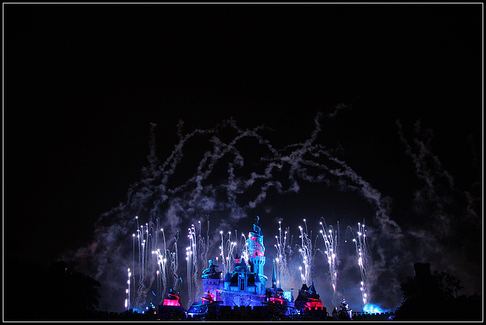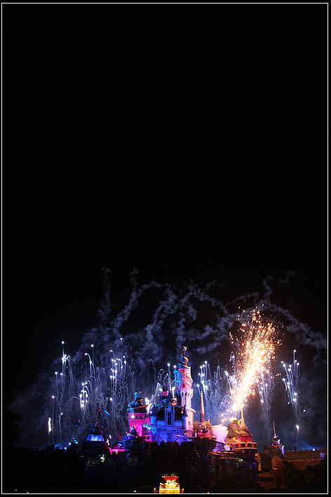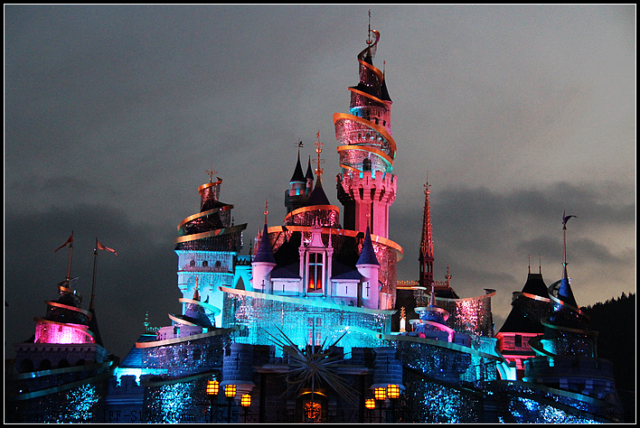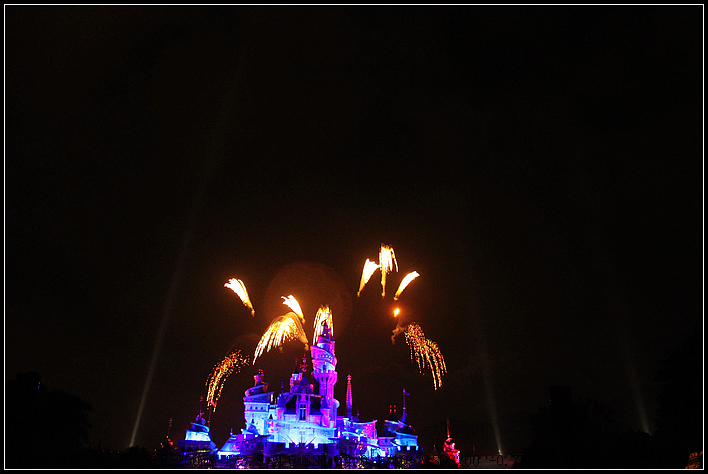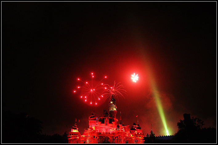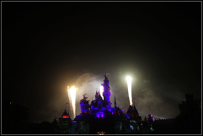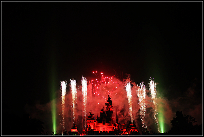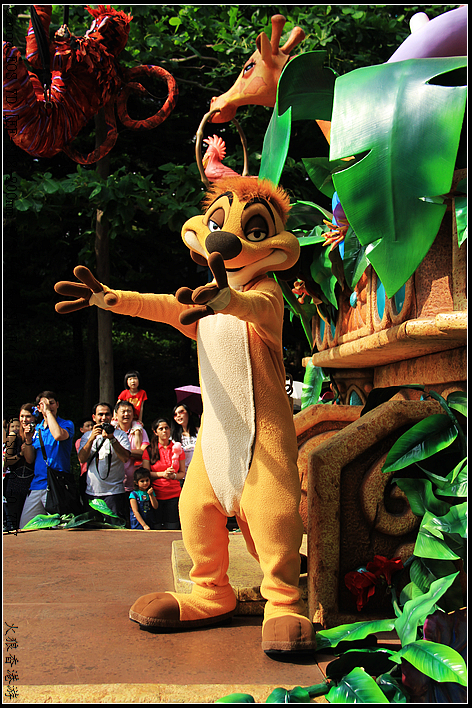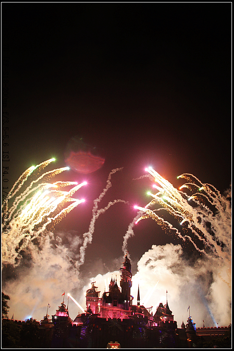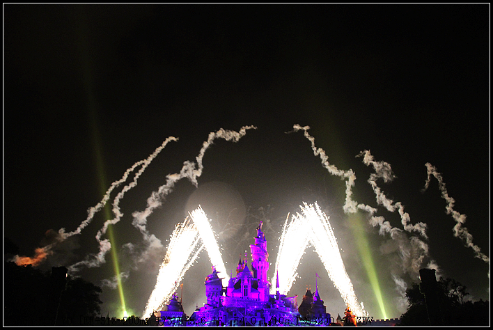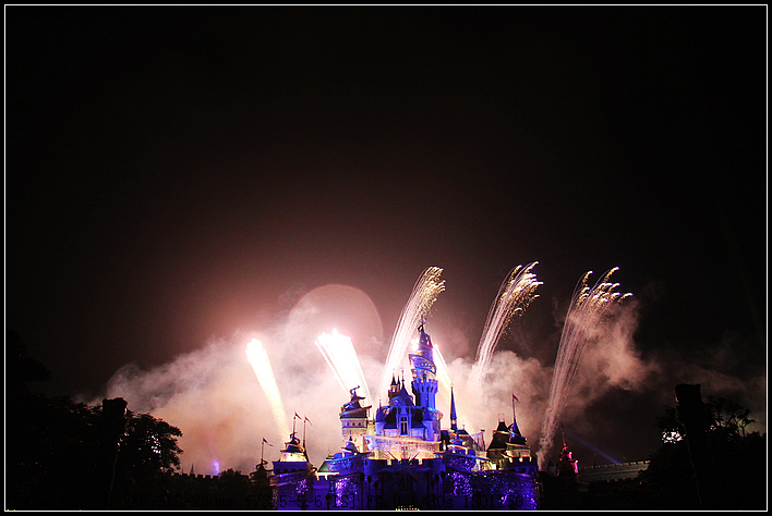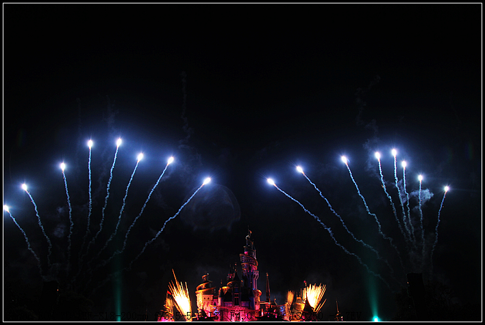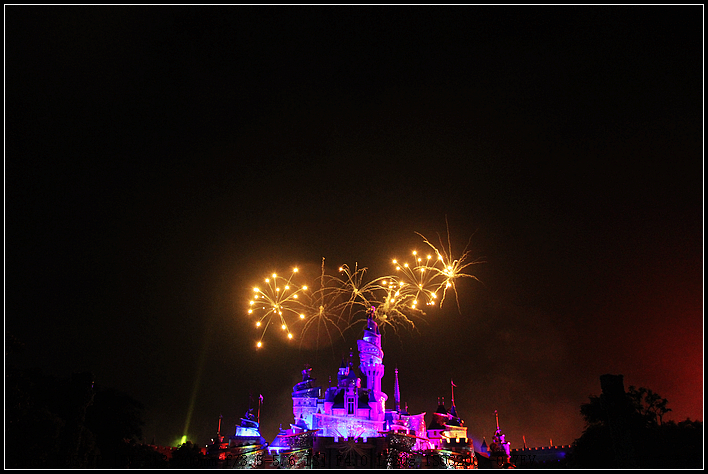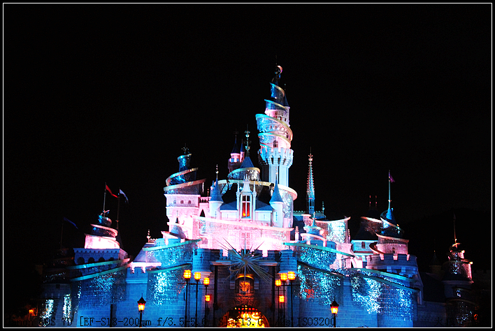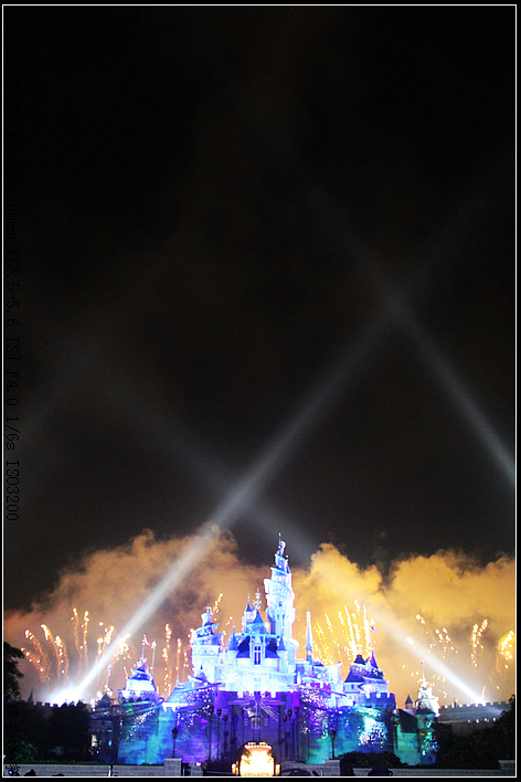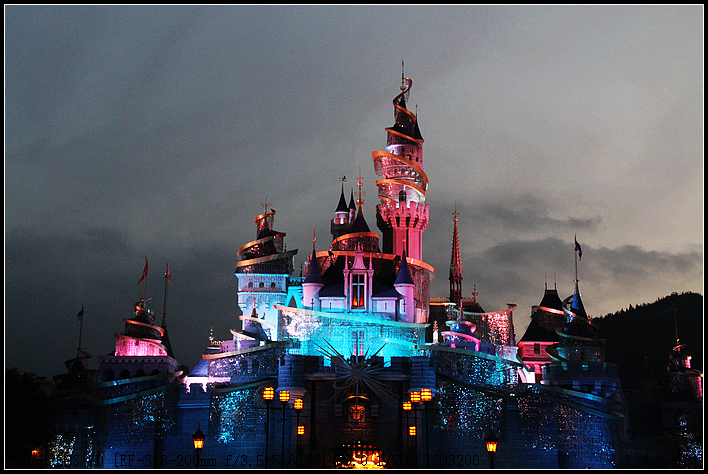 城堡入口正好直对着旋转木马。。演出开始时,木马也停止转动了。。