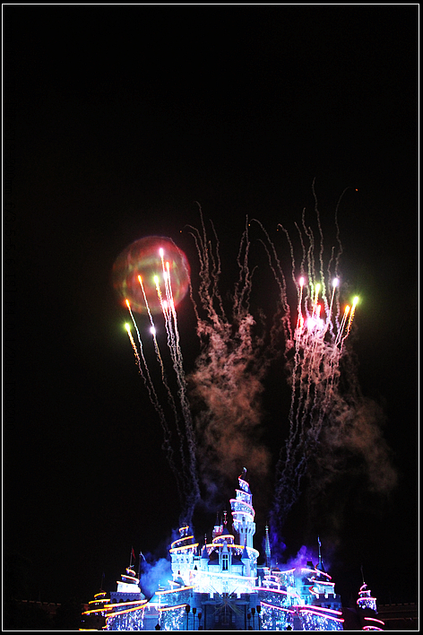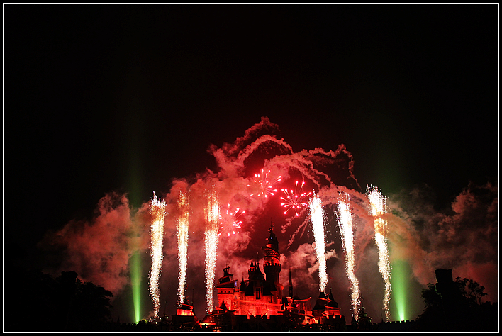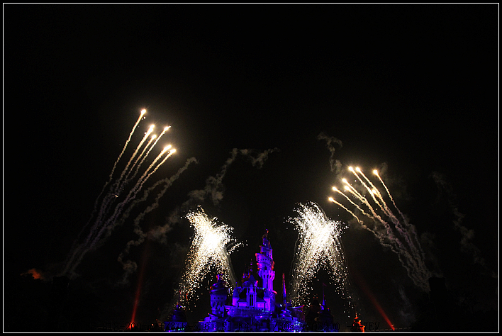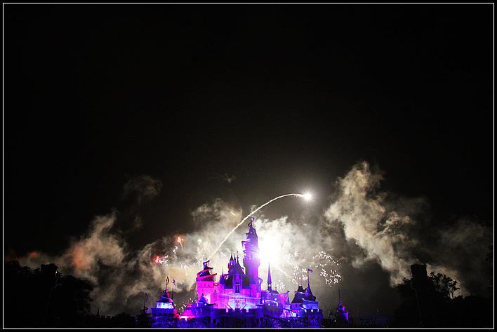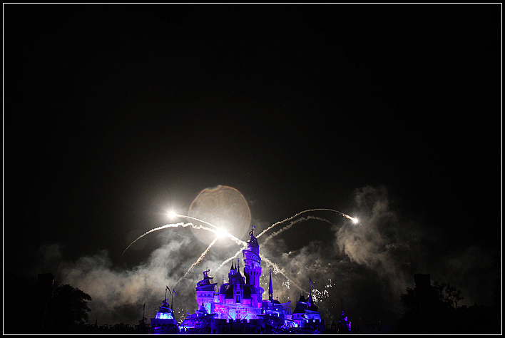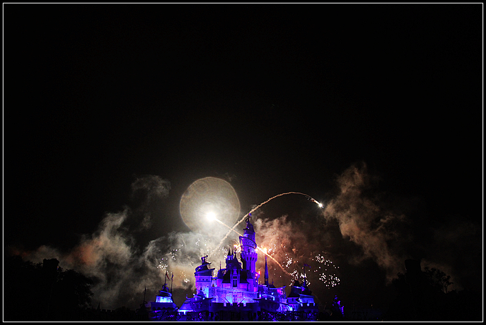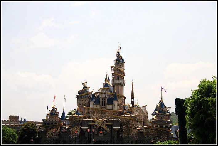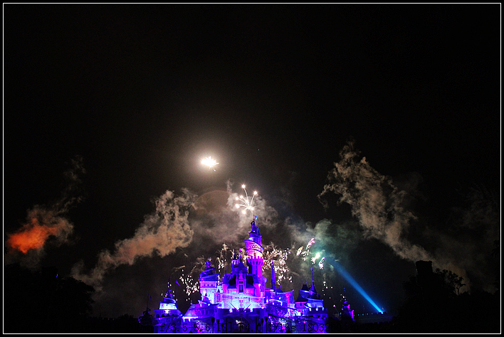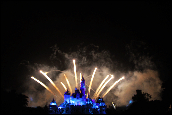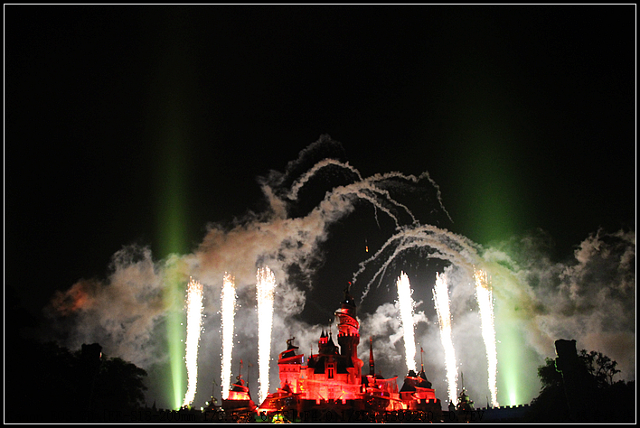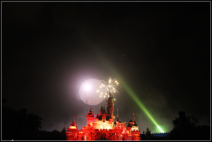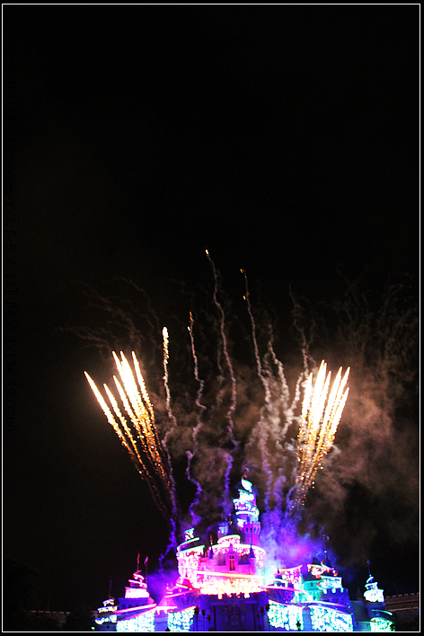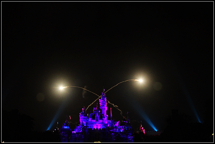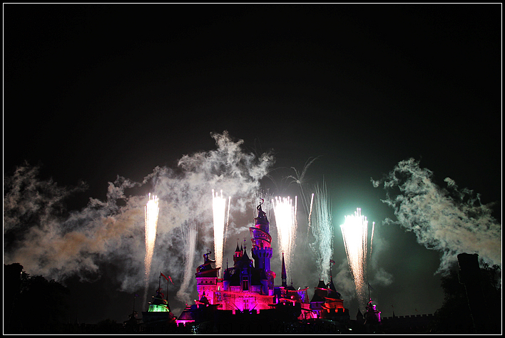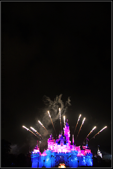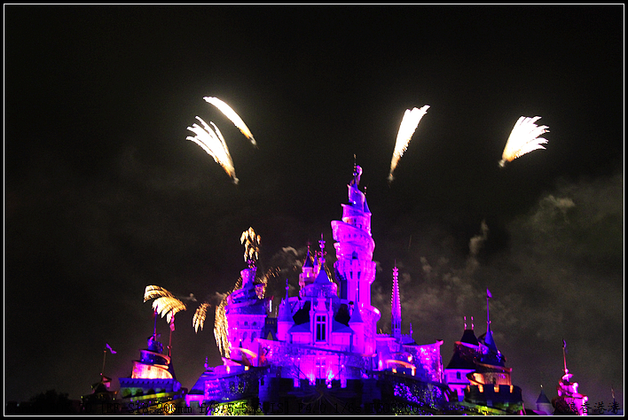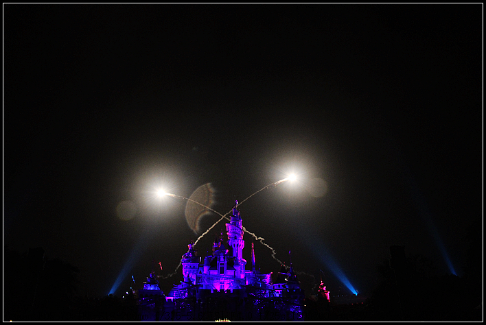 城堡入口正好直对着旋转木马。。演出开始时,木马也停止转动了。。
