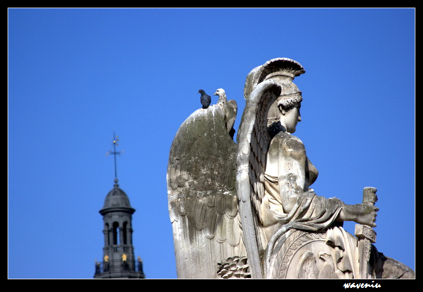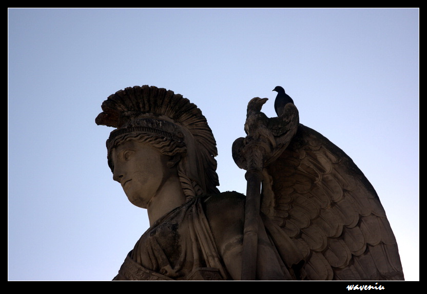 我很喜欢这张照片:象征和平 的活生生的鸽子与象征战争的石雕的雄鹰在一起。