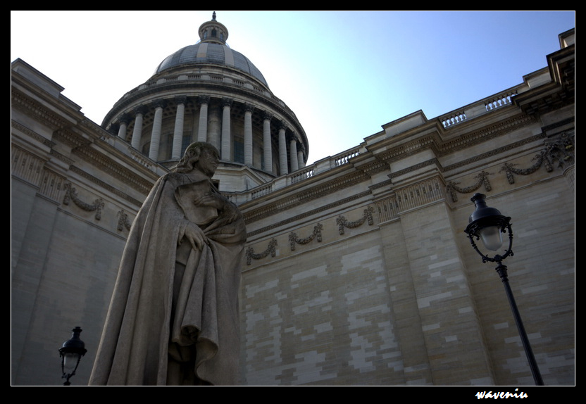 补充一点网上抄来的介绍:先贤祠 (lePantheon)位于巴黎 市中心塞纳河 左岸的拉丁区,于1791年建成,是永久纪念法国 历史名人的圣殿。它原是路易十五时代建成的圣·热内维耶瓦教堂,1791年被收归国有脱离宗教后,改为埋葬“伟人”的墓地。先贤祠 内安葬着伏尔泰、卢梭、维克 多·雨果、爱弥尔·左拉、马塞兰·贝托洛、让·饶勒斯、柏辽兹、马尔罗和大仲马等。至2002年11月,共有70位对法兰西 作出非凡贡献的人享有这一殊荣。