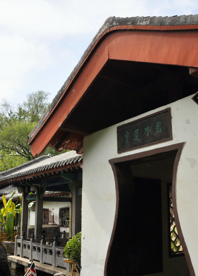 来鹤坊立于来鹤桥的南端,是两柱一楼式,丹柱青瓦,斗拱承托,南北各悬“洞天福地”,“蓬莱旧迹”匾额。