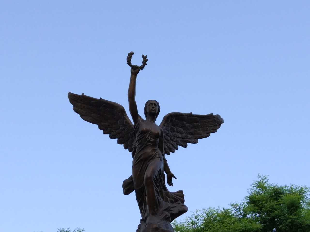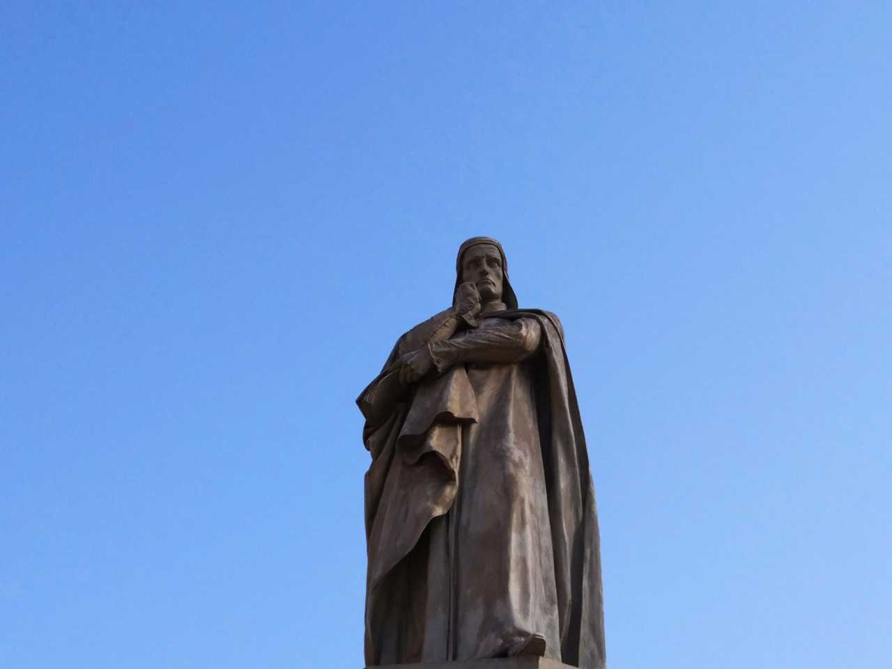 但丁广场的但丁雕像。但丁广场上有一块独一无二的地砖,这块地砖位于广场最中央,雕刻的是但丁的头像。是但丁广场的特色之一。