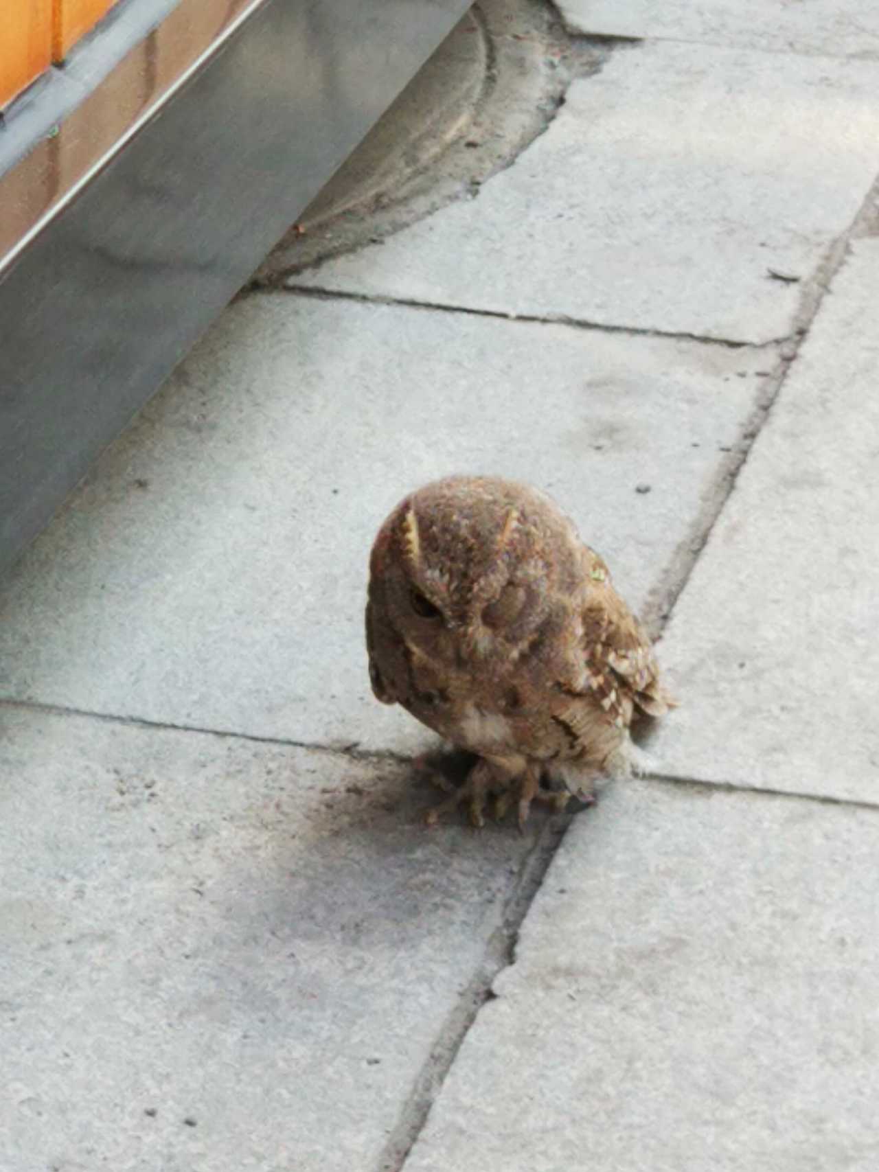 很悲催的猫头鹰(旁人都说是),我和妈妈刚巧走到这个地方,突然听到“哐”的一声,特别大的声音,把我妈妈都吓了一跳,不知道是什么东西撞到了旁边的推车玻璃上。刚开始我以为是谁仍什么东西砸过来的,因为正好从我们的头上飞过去,撞到的。当时特别生气,还在说是谁这么没有素质,大白天的扔东西。后来我一转身,发现地上有一个不知名的小动物张着翅膀,一直在抖,好像撞蒙了一样,一直在慢慢的一点点的恢复意识。当它慢慢转过头来的时候我们发现好像猫头鹰啊。这时旁边围了很多人过来看,都在问我它怎么了,好像当时我们距离最近,看到了整个过程,当时还在替它担心。这时旁边的商贩拿了一个笼子过来,把猫头鹰带走了。围观的群众也就都离开了。
