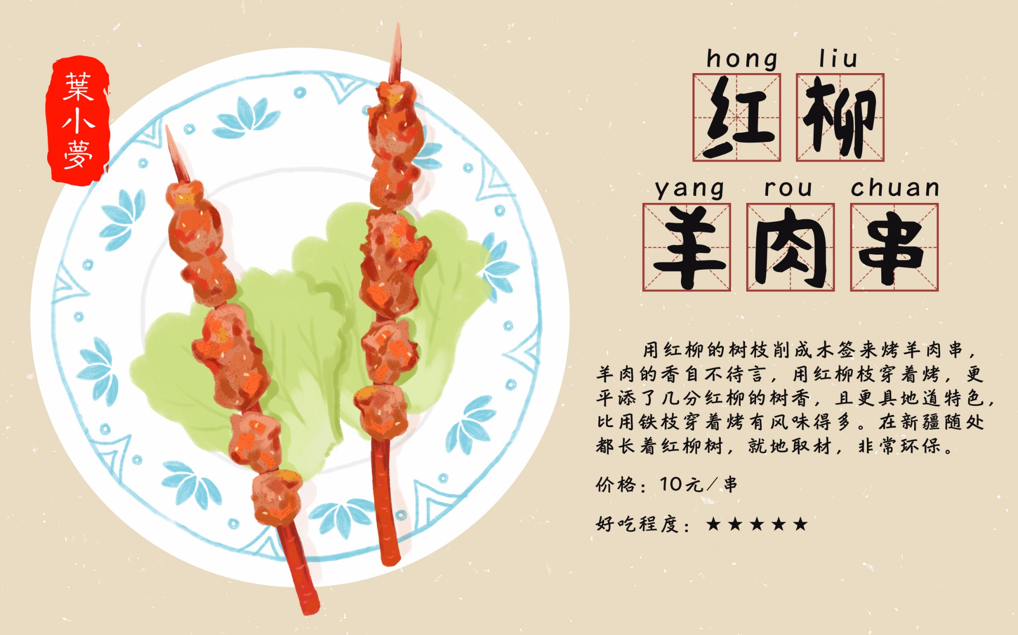 红柳羊肉串是南疆阿克苏的阿瓦提县的传统特色,红柳枝烤羊肉串除了块头大,还有浓郁的香气,焦脆的羊肉外皮,饱满新鲜的肉质(讲到这里不由得口水又留下来了啊!!)。用红柳的树枝削成木签来烤羊肉串,羊肉的香自不待言,用红柳枝穿着烤,更平添了几分红柳的树香,且更具地道特色,比用铁枝穿着烤有风味得多。