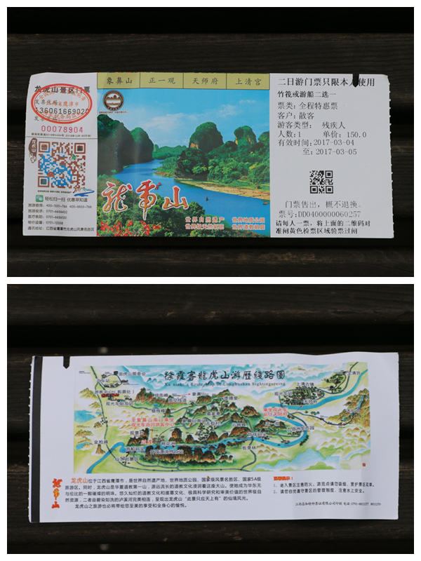 龙虎山门票两日有效,其实一天游览时间足够。凭证可免门票,150元是竹筏票据,只能使用一次。这是“残疾人”的好处之一,八级伤残包括:1)边缘智能;2)精神疾病有人格改变者;3)性功能障碍。。。等等等等,俗称弱智、疯子和性无能,洒家就是不告诉你我属于哪一种。有本事你猜,猜对了我就告诉你。。