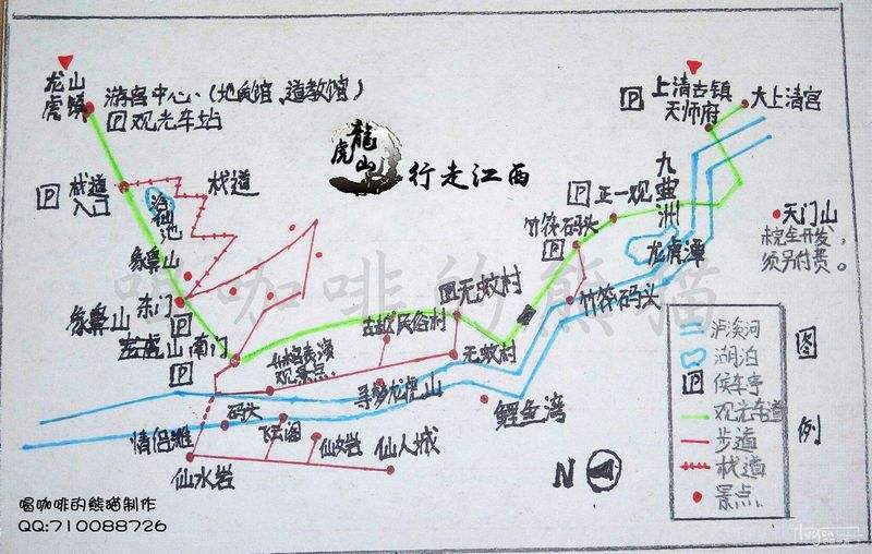 看网友制作的手绘地图,游览线路分两种,步行和水路。步行亮点是栈道,水路亮点是竹筏。两者是龙虎山精华,切不可错过任何一处。无论那条路,景点之间还是要靠观光车接驳。
