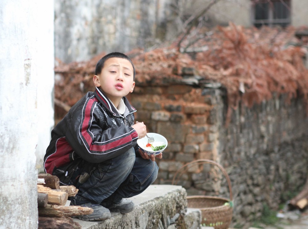 当地人有一个习惯,就是吃饭的时候,都会端着碗或者蹲在门口吃,或者蹲在村里的其他地方吃。这个男孩的晚饭十分简单:一碗米饭、一点青菜和辣椒酱。