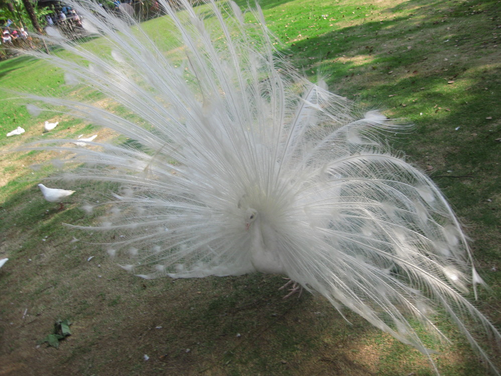 其实白色的孔雀很漂亮的,只是可惜,不知大家看到没有,它的翅膀断了一截,
