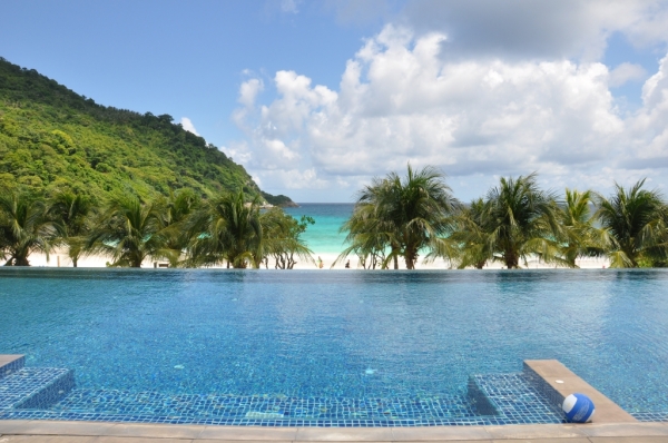 无边泳池与大海连成一线。