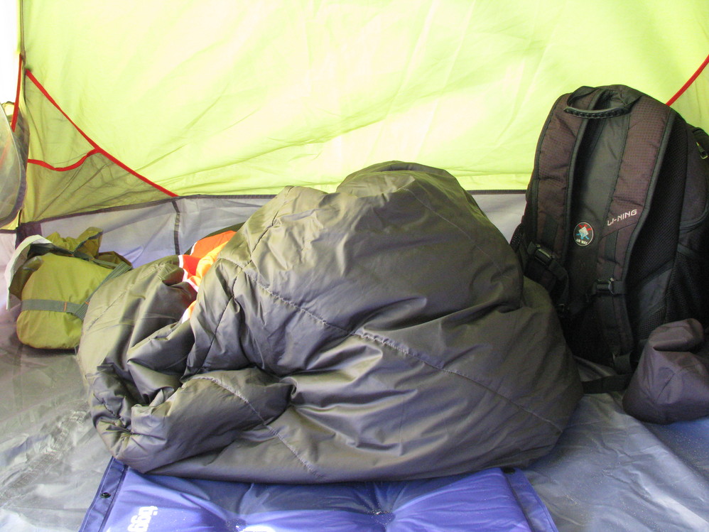 窝内情况,睡袋、防潮垫都很给力。但是我的背包不行,没有登山包,只有个休闲书包,悲剧啊悲剧啊,回头必须买个了。