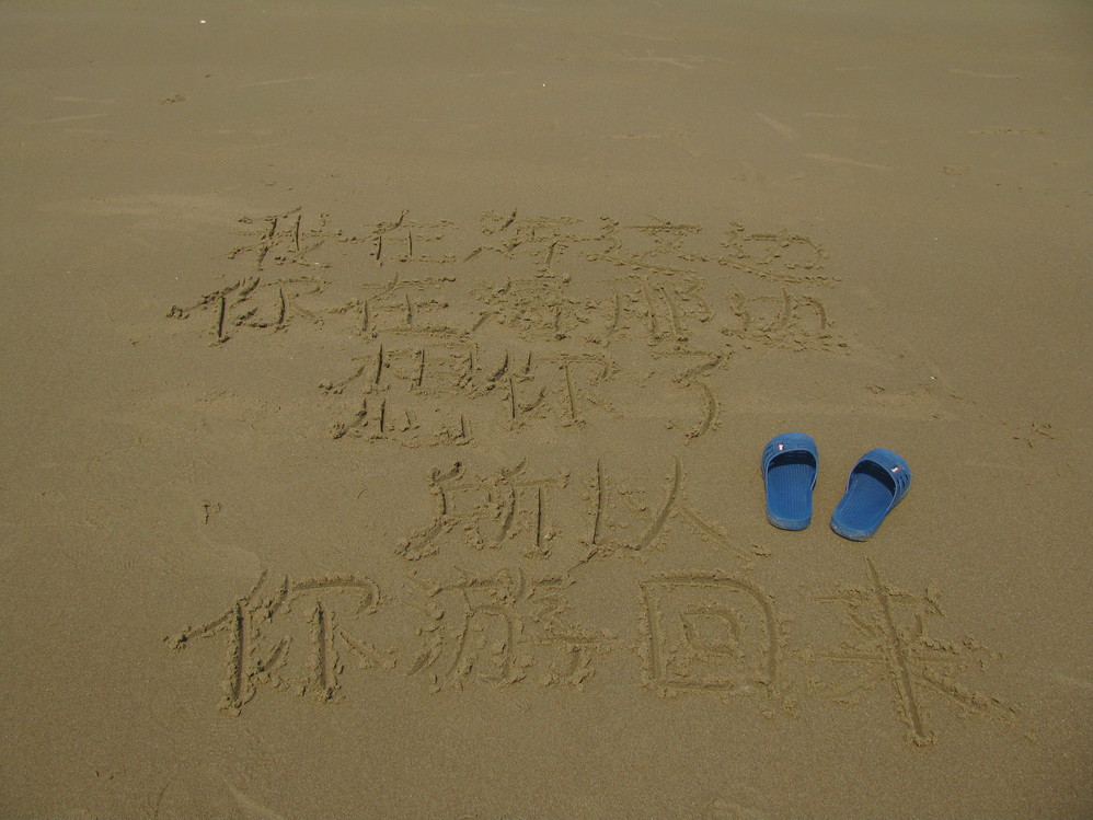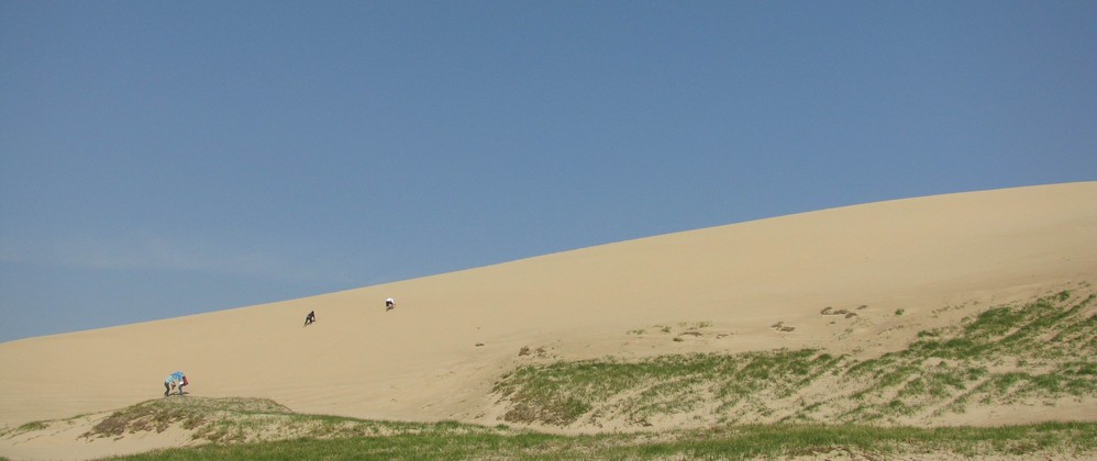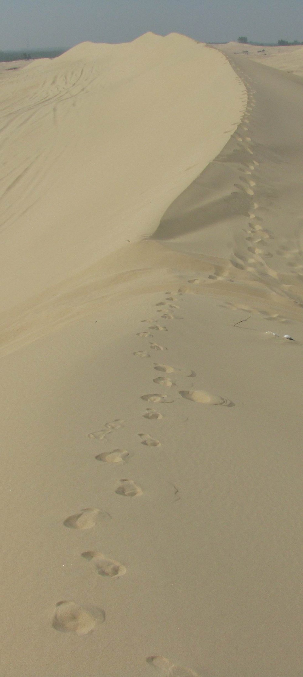 跟着他人的脚步,爬上了一个小沙丘。向远处望去,是一个接一个的沙丘,高高低低,起起伏伏。纠结了一下,便离开众人向那最高的沙丘进发。顶着炎炎烈日,吹着已经不怎么湿润的海风,吹随着不知是谁留下的足迹,缓缓的前行,有种说不出的感觉。想赞叹一下造物的神奇,又想吼出心中的舒爽。但终究还是什么都没有做,把那份惊奇留在心中,一步步前行。
