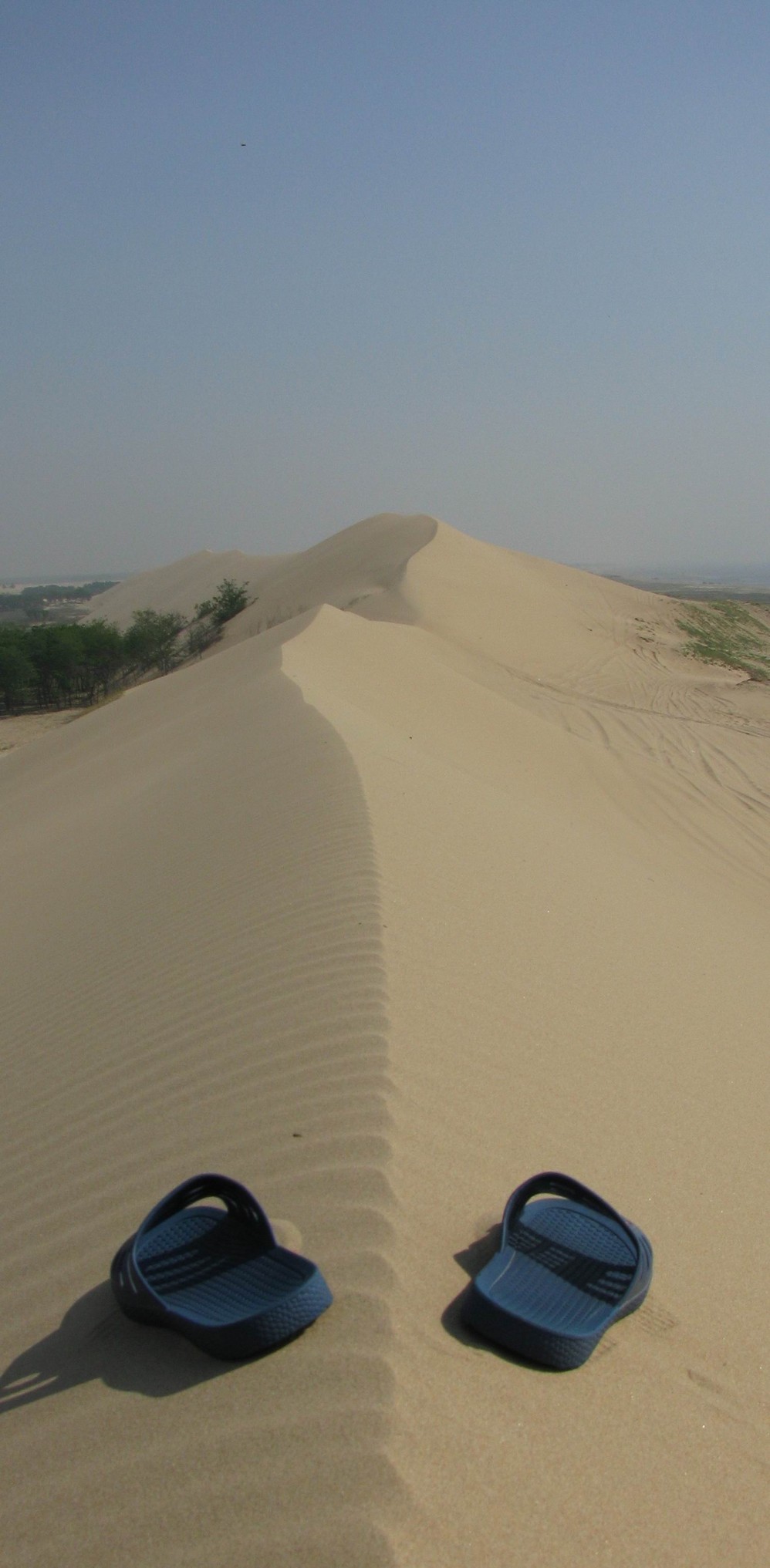 小憩一会,准备下山了。将拖鞋直接扔下,然后冲过去捡它们,就这么,就下来了。转身,忘了一眼身后的沙丘,天在它的映衬下显得越发的蓝。目光略转,发现有人正在向那最高峰发起冲击。分兴奋的对他们说:‘去追寻哥的足迹吧!’可惜,太远,他们没有听见。