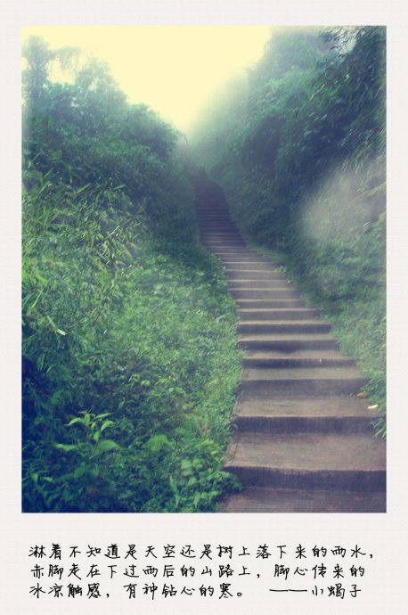 回程的路上,一滩烂泥挡住了我们的去路。一脚下去,泥深及膝。好不容易踩稳,脚却拔不出来了,只好在烂泥里到处乱蹬;好不容易把脚拔出来,鞋却不见了,只好又回到烂泥里摸鞋。我们和几个路人相互搀扶着,深一脚,浅一脚,半晌才终于征服了那滩烂泥,鞋子却已经变成了几个大泥坨。还好山里到处都在下雨,我们就一路走一路洗,一路洗一路走。没有去白云古寺我并不遗憾,因为比起用一颗浮躁的心去打扰一个安详的圣地,在烂泥中的冒险更符合我们的心境——而且我喜欢冒险。