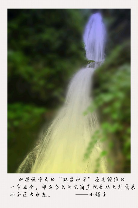 第二天的旅程,多少有些冒险色彩。我们沿着前一天走过的路线,再一次来到了“双泉水帘”。如果说昨天的“双泉水帘”还是缠绵的一帘幽梦,那么今天的它简直就是从天外飞来的两条巨大水龙。一座天桥横空出世,斜跨在水龙之上,有如腾云驾雾般。