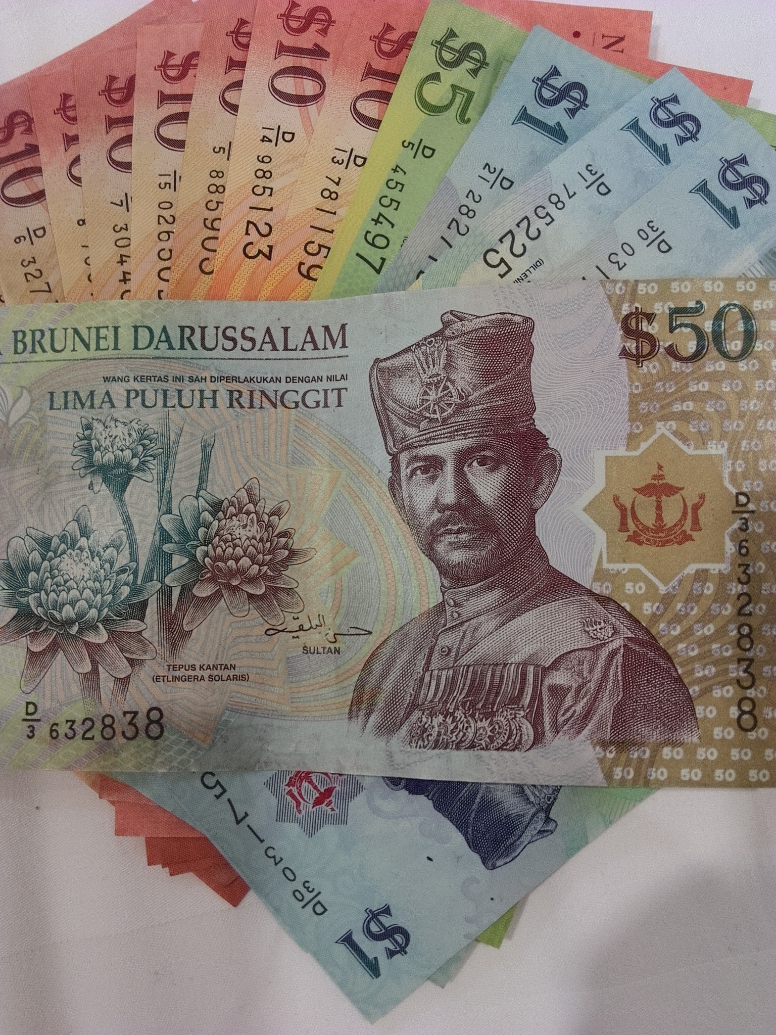 出发前在国内银行换好的新币,头像是尤索夫总统,别看文莱那么有钱,100面额的他们还真不是人人都见过,每次收到,都要仔细看很久,搞得我像是假钞贩子似得,尴尬啊~