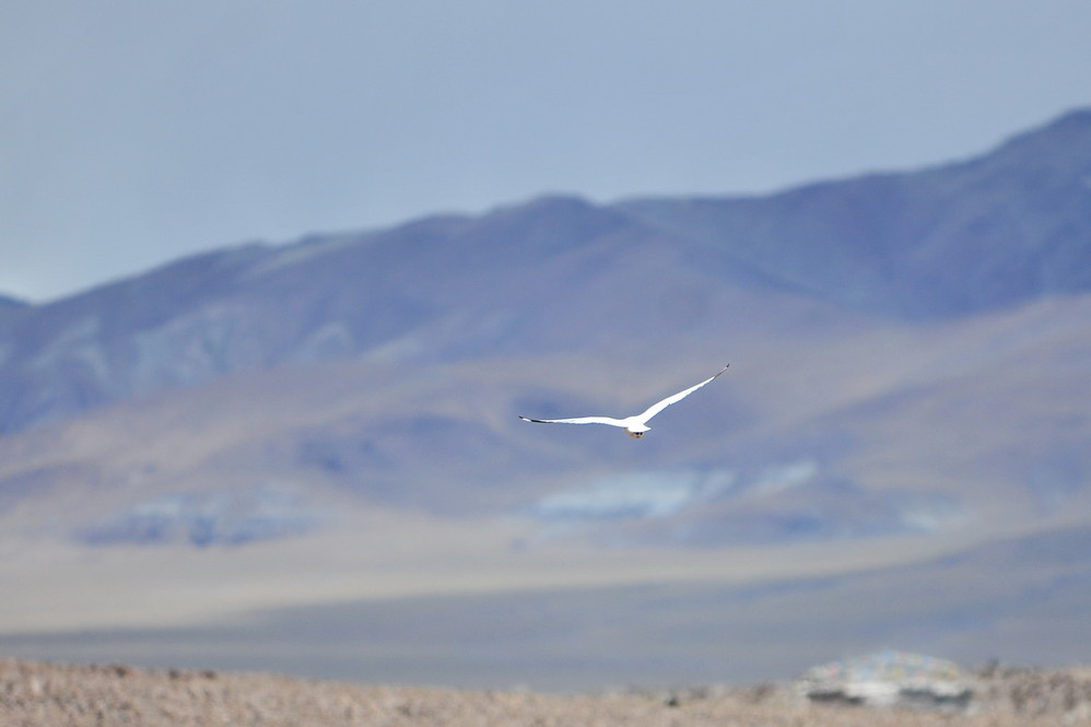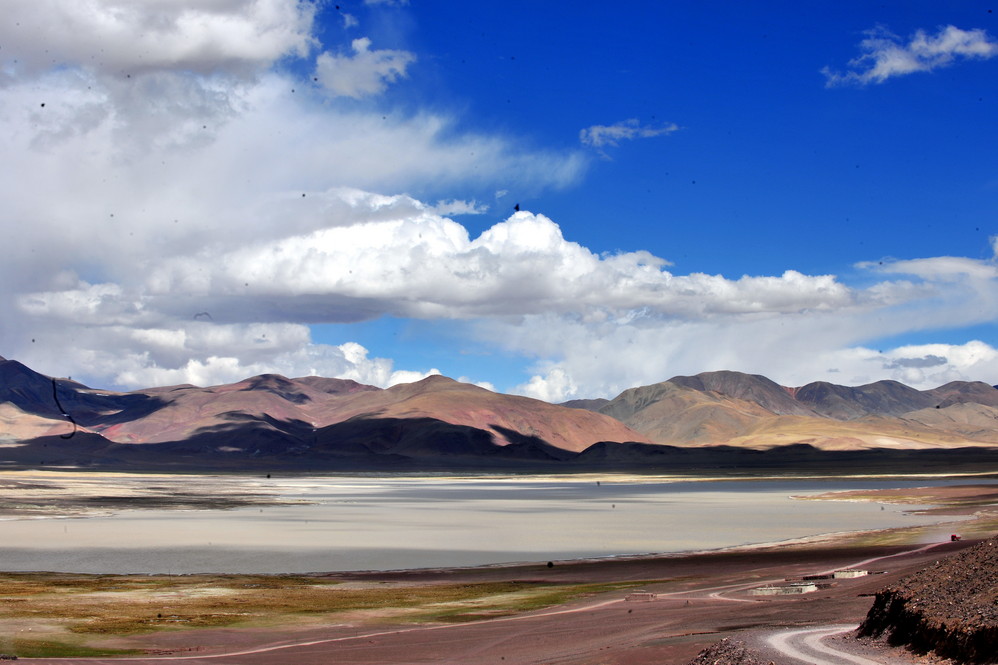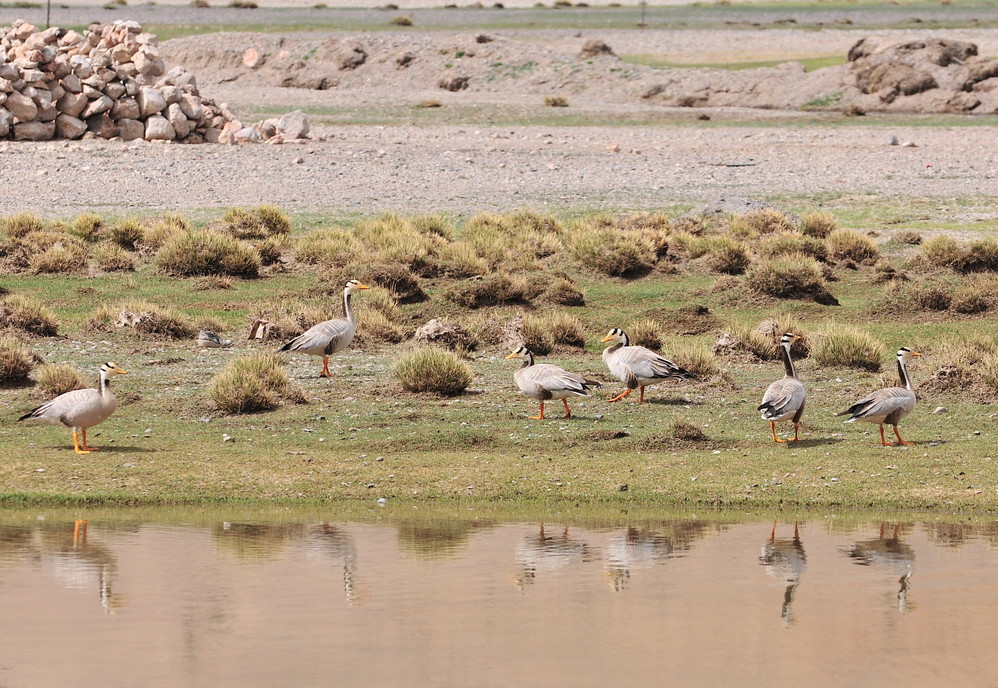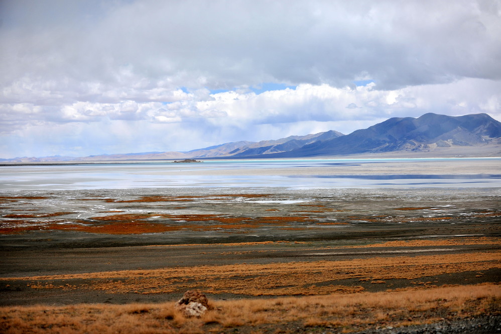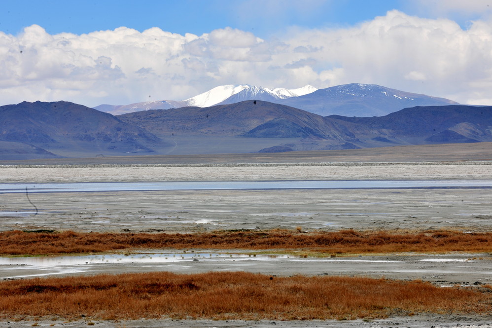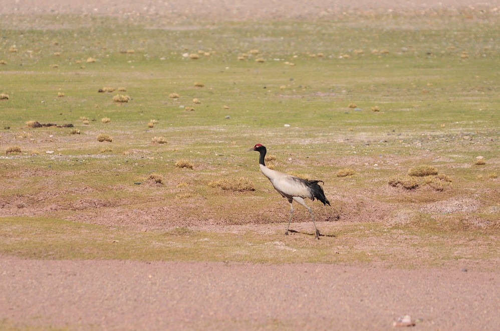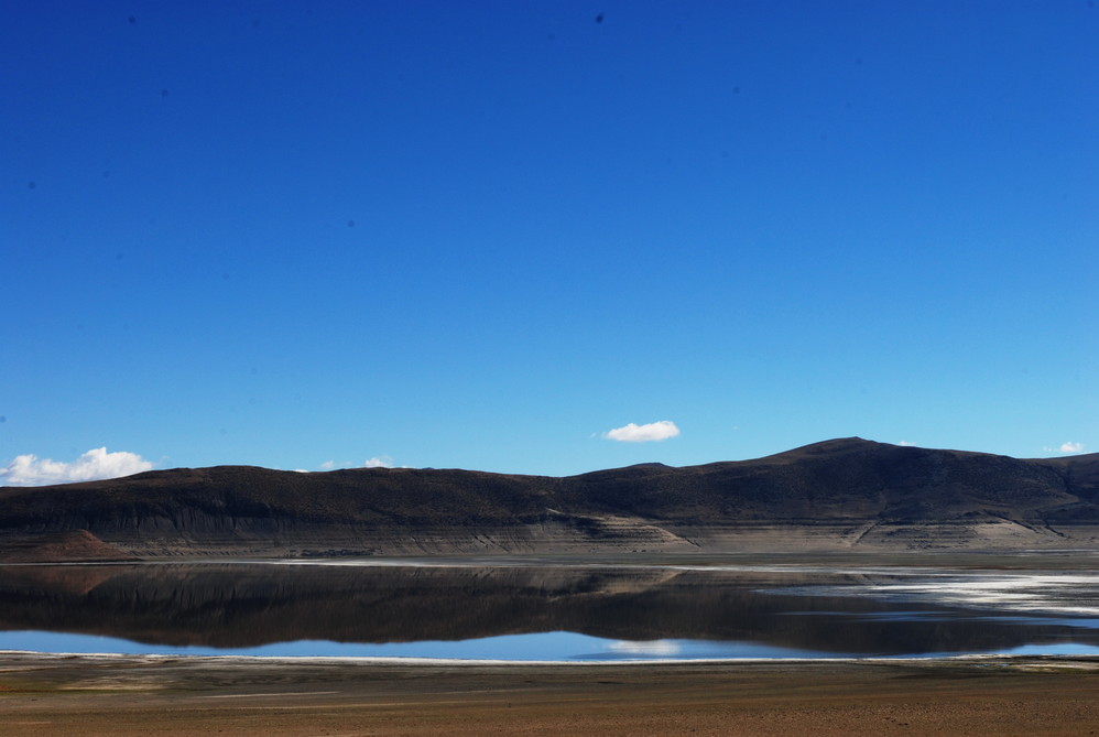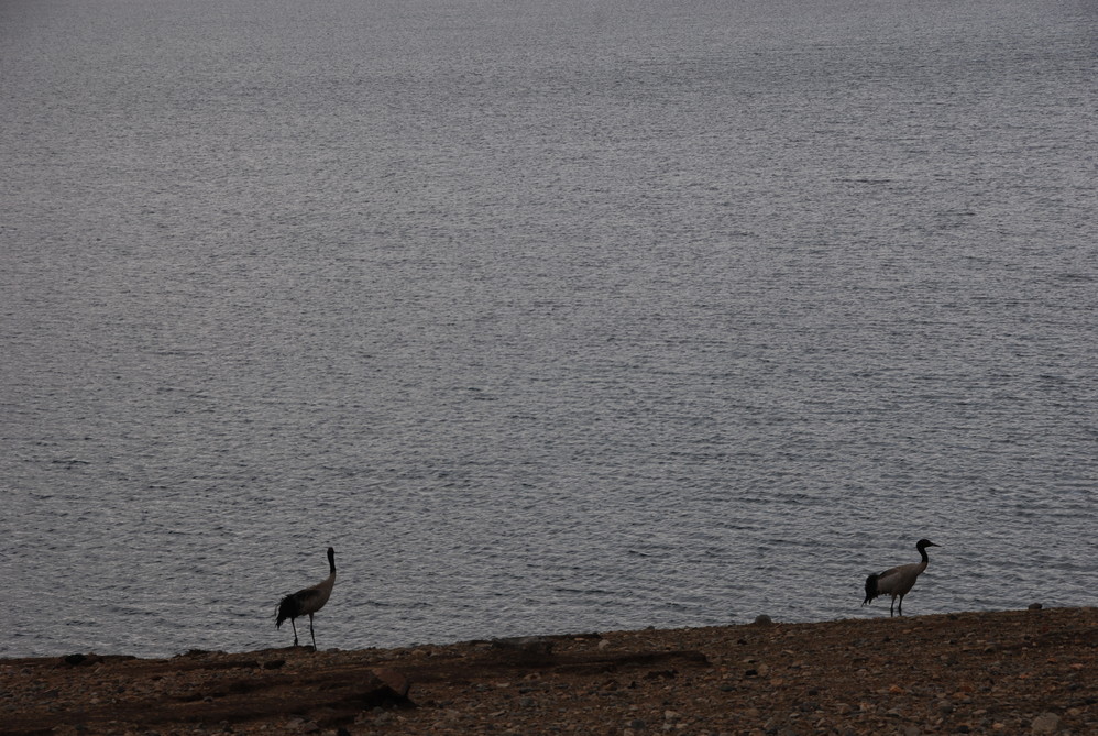 出来后,很快我们又见到一个错,这是仁青休布错,一个蓝色的错。但我确实不知道怎样把她拍出来,那么漂亮的湖水和雪山,还是坚持乱拍一通,继续前进。之前在其他人的游记中,这是一段“一错再错”的路,后面我们走了很久、行了很多很都没有见到错,所以在一个无名小湖边停车也拍了一通,bobi说,连这个小水塘都不放过?没办法,有好风景就拍吧。不过我们过了不久,我们就到了第二种颜色的错了,扎布耶错,据说她是分为两边,北边是红(紫)色的,原因是锂含量是全世界最高,南面就是白色的盐湖,但或许我们和司机都是第一次走,并没有看到红色的湖,只看到了岸上的红土地。在这里,我们看到几只黑颈鹤,做了一回鬼子,偷偷走过去拍了一些照片,运气还不错。