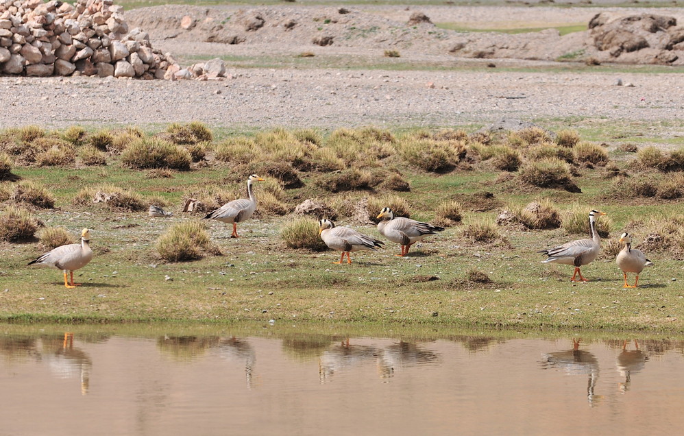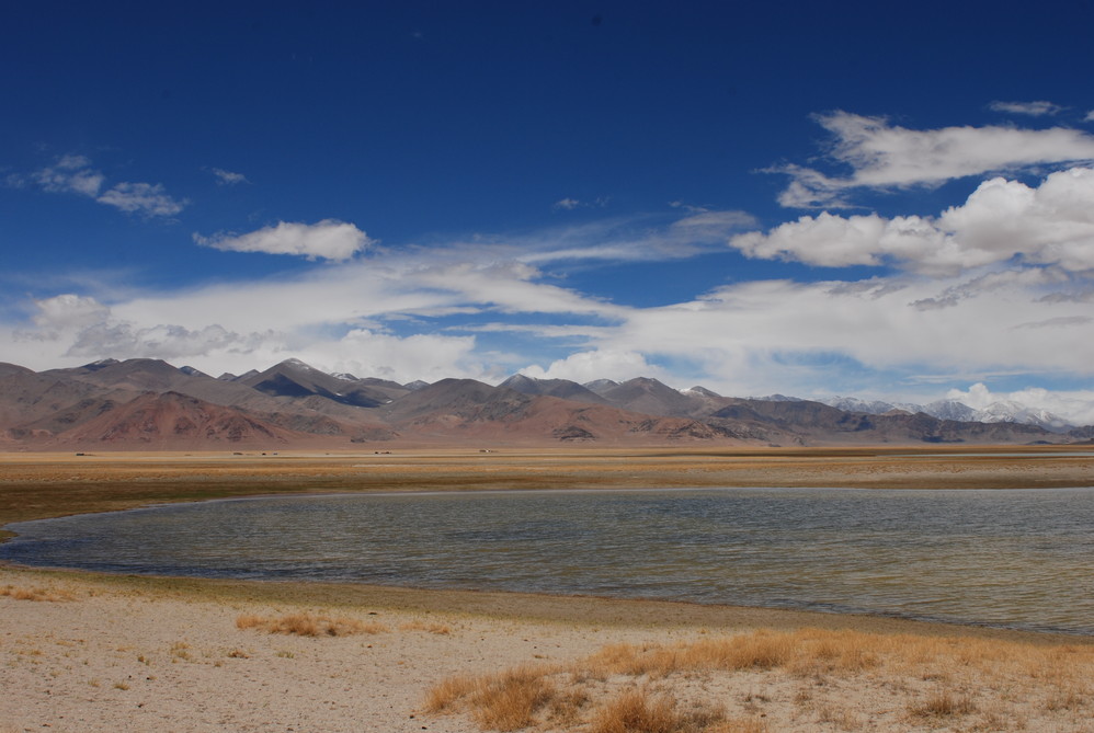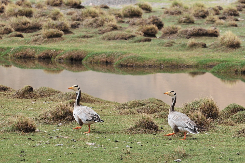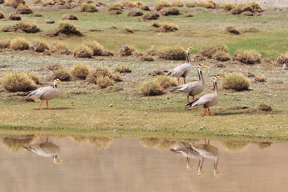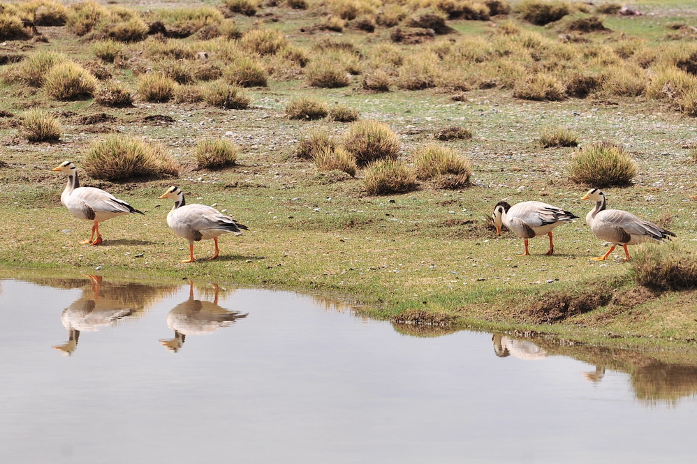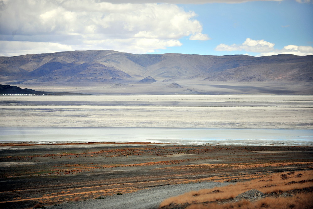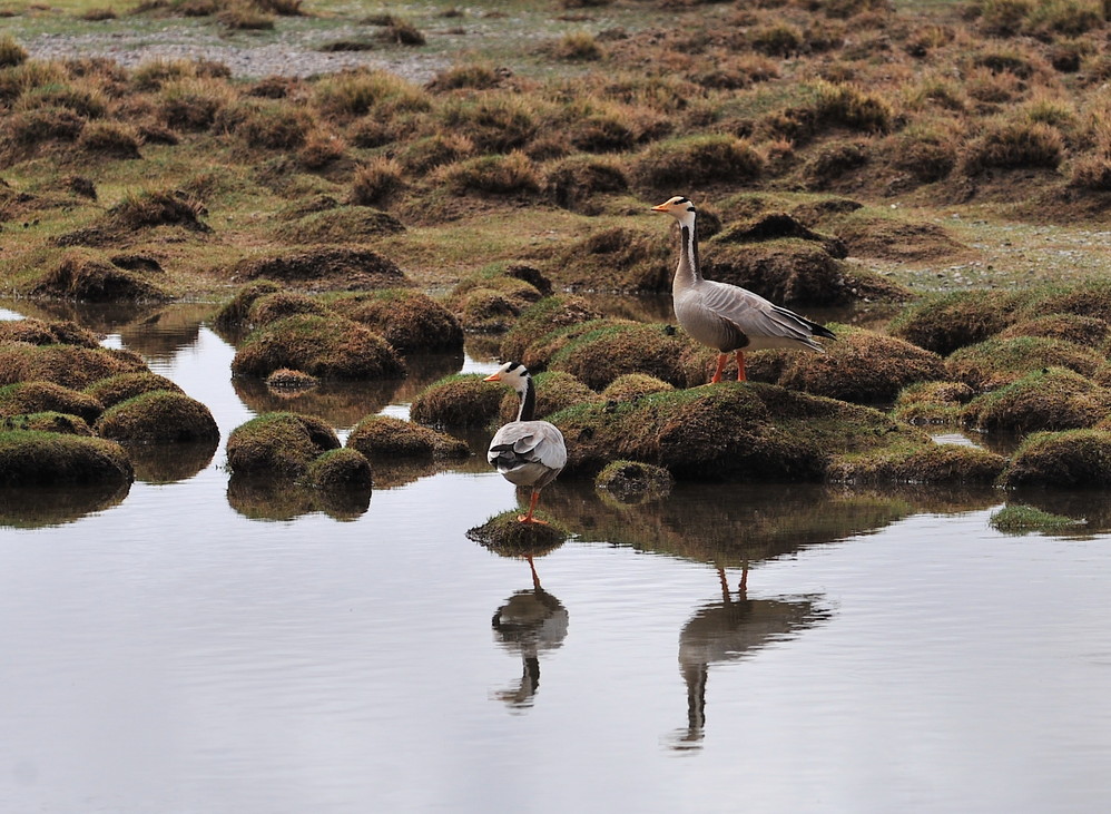 出来后,很快我们又见到一个错,这是仁青休布错,一个蓝色的错。但我确实不知道怎样把她拍出来,那么漂亮的湖水和雪山,还是坚持乱拍一通,继续前进。之前在其他人的游记中,这是一段“一错再错”的路,后面我们走了很久、行了很多很都没有见到错,所以在一个无名小湖边停车也拍了一通,bobi说,连这个小水塘都不放过?没办法,有好风景就拍吧。不过我们过了不久,我们就到了第二种颜色的错了,扎布耶错,据说她是分为两边,北边是红(紫)色的,原因是锂含量是全世界最高,南面就是白色的盐湖,但或许我们和司机都是第一次走,并没有看到红色的湖,只看到了岸上的红土地。在这里,我们看到几只黑颈鹤,做了一回鬼子,偷偷走过去拍了一些照片,运气还不错。
