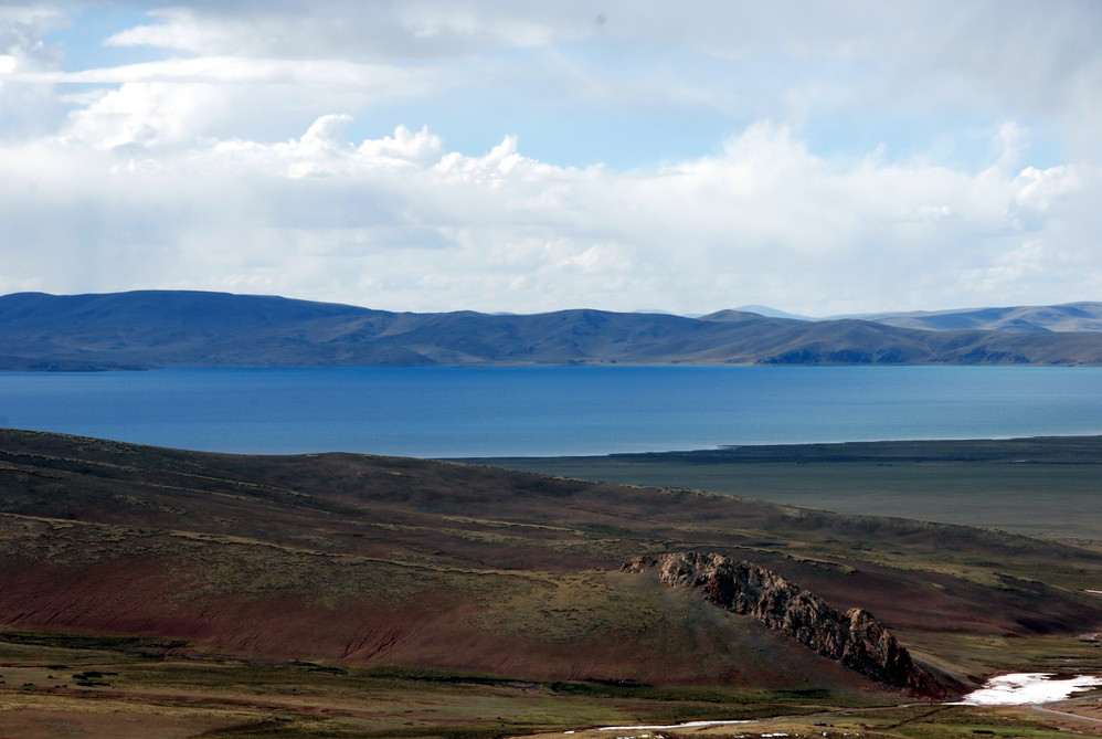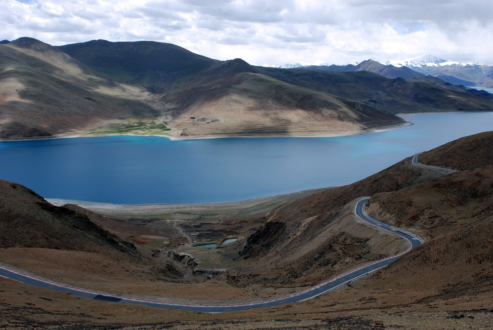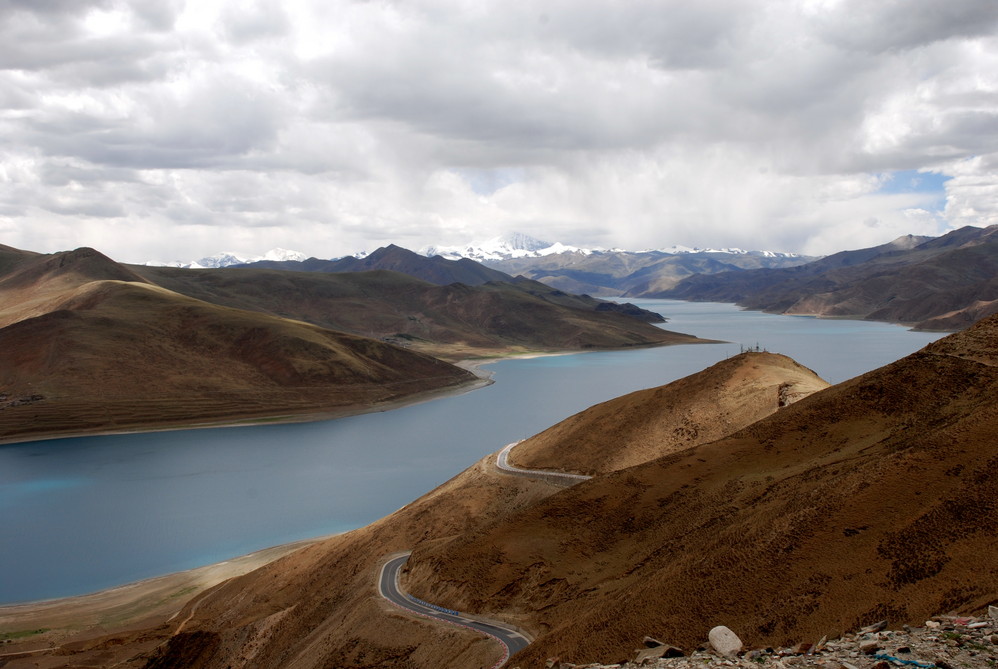 羊卓雍错是故地重游,在湖边走时,还有一些阳光,走上甘巴拉 山口 观景台,天上飘着厚云,湖面上有些地方还能有一点阳光,山上光彩差了些,不过羊湖是漂亮,湖边的弯曲的公路伴着湖面,还有湖面上阳光照到的浅蓝色斑点,确实是一幅非常和谐的图画!等待了差不多半个小时,看来天空的云看来很难散去,于是不舍离去!