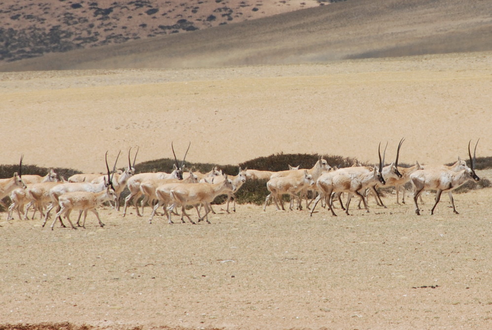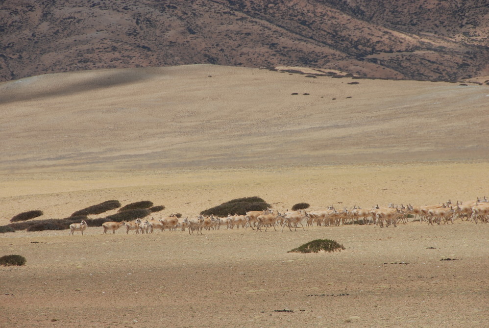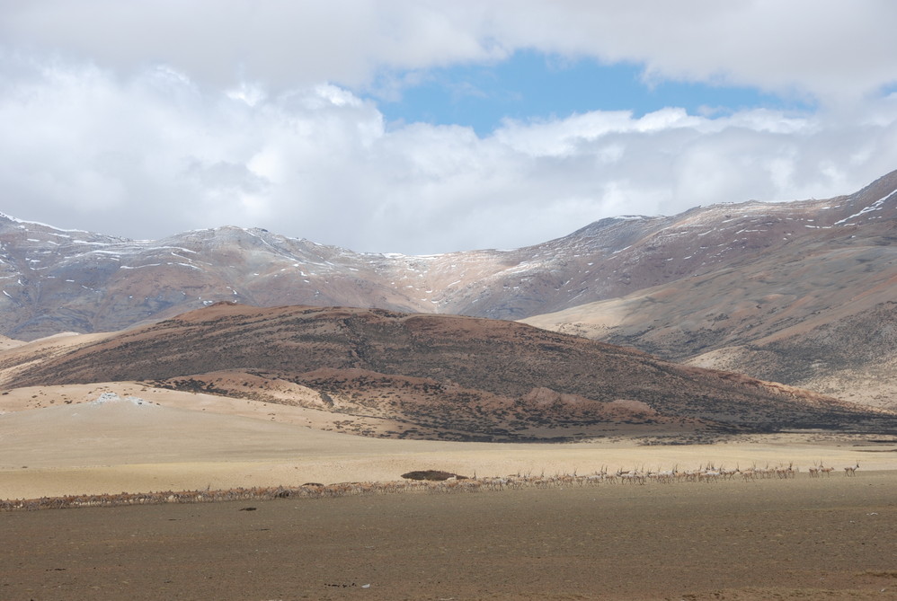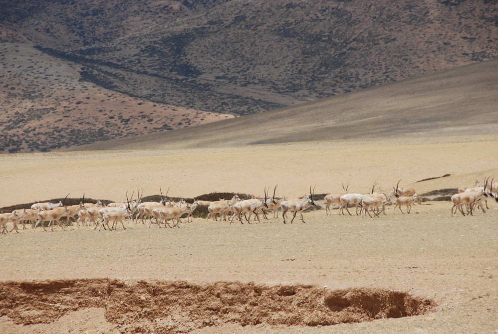 饭后继续出发,快到仲巴 ,沙漠的风景出来了,虽然没有我之前在网上看到相片的壮观,但近处沙漠,稍远河流,再远雪山的风景也是很漂亮,只是天空有点多云,所以没有怎样拍照。不过我们说完美一天是肯定有收获的,我们碰到了可能是我们这辈子能看到的最大一群藏羚羊,当时我们普琼突然停车,我们由于没留意,还以为什么事情,普琼惊喜大叫“藏羚羊!”那里我们才看到路边极大一群藏羚羊,我用我的广角端都拍不完这群藏羚羊,我心想可能超过100只,前面是一群公羊,后面是一群母羊,密密麻麻,根本是数不清的。用相机拉到最大变焦,那群公羊、特别是头羊,又长又尖的羊角,黑黑的面,确实是威武!普琼说,连他都没有见过这么大的一群的藏羚羊,他猜可能是这群藏羚羊可能是一起出来吃水,所以我们能看到,这是我们一群人的运气啊!泉他们之前没有发现,车在前面停远了,但发现后都跟我们一样,狂拍!看到藏羚羊是要运气的,何况我们看到的是不可思议数量的一群,这真的是我们不远万里来的第一次惊喜吧!