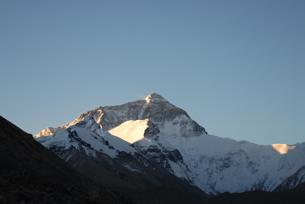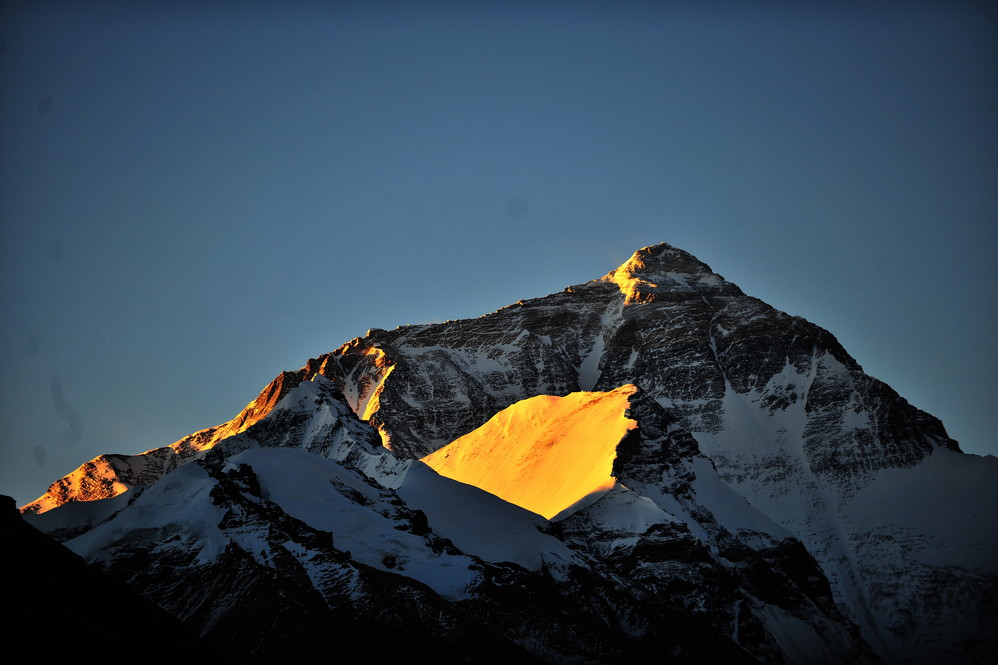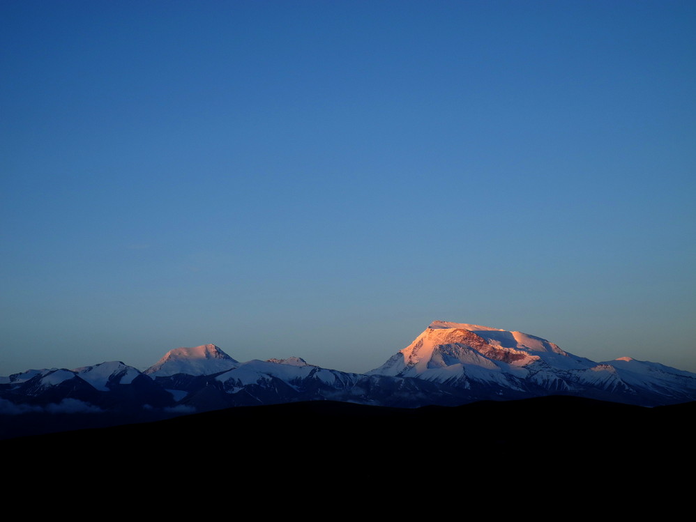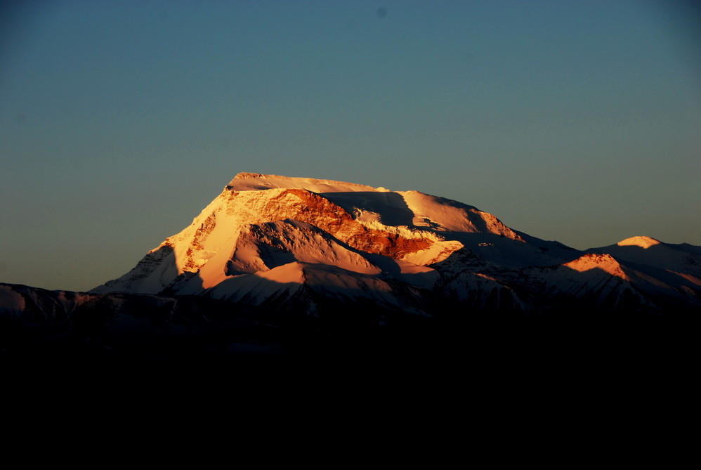 6月3日,珠峰回日喀则 。珠峰晚上一直乱着大风,早上一觉醒来已经是七点,真的很冷!bobi出去瞄了一下,说应该快日出啦,不过现在还没有。结果照顾下太太起来,搞了几分钟,bobi在外面就叫啦,出来啦,太阳出来啦!立刻走出门口,果然,太阳已经照到珠峰顶上啦!光线从左边一侧过来,所以只有顶上一点点和左侧一面照到了阳光,而且今天一点云都没有,太精彩的日出啦!心想日落和日出都看见啦,真的不枉此行!