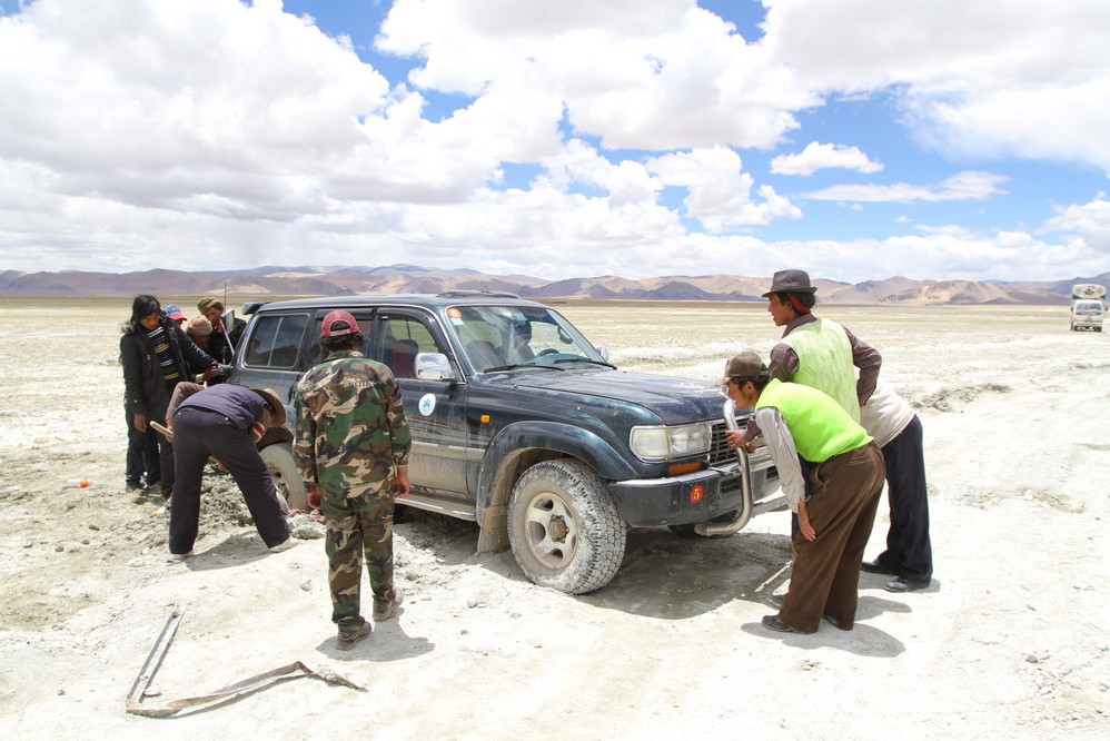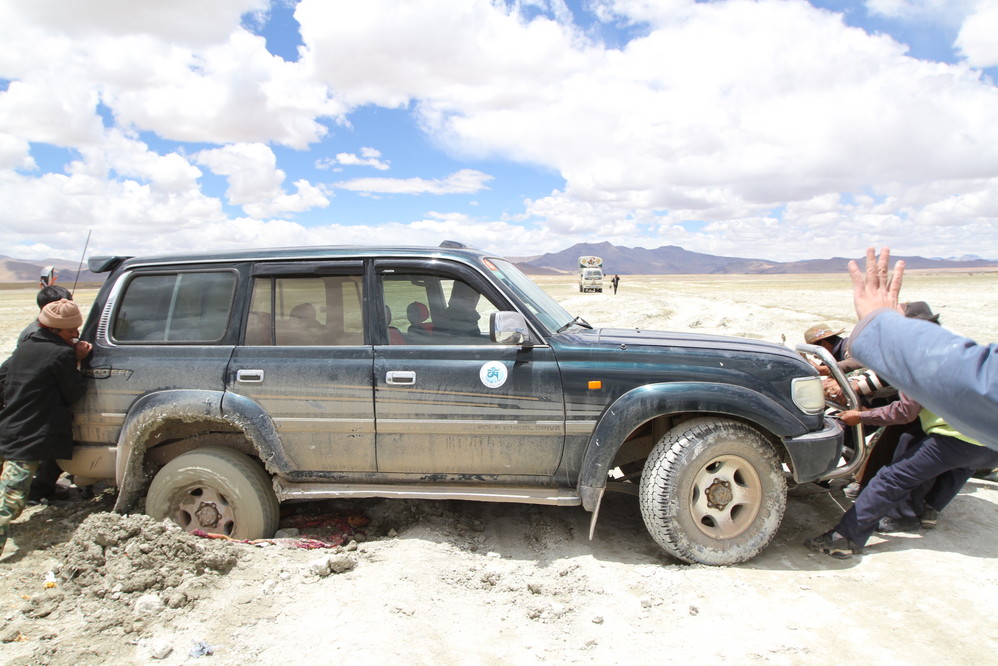 普琼问的路,真的是开到扎日南木错湖边的,但我们忘记了这个错还有一个名字:扎日南木湿地!当我们车从措勤 县城开出来往湖边走了七、八公里左右,连湖的影子都还没看到时,路已经开始烂起来,普琼发现不对劲时,他想调头走,结果车子往后一退,两个后轮就陷进了后面的松土里面,而且经过两次尝试后退开上来不行,连四轮驱动都用不了,叉分器也被泥土卡住啦!我们尝试了好多方法,车还是上不来!而且趁着一点点信号打了电话找扎西想请住宿的招待所帮忙也没有回音。后来看见附近放牧的牧民,找到他们帮忙,他说有一辆摩托车可以租给我们去县城求救,租车费用是80元,多强的市场意识!他说可以去县城帮我们去找人来,但我们要帮他看羊,不能被流浪狗给咬啦!我们机会做一回牧民!?好像挺爽,不过真有流浪狗来咬了羊不是赔很多?算啦,车一定得租,但牧民还是不能当!那个牧民真的走路去开摩托车了,我们一边看着自己的车,一边看着他的羊,心想那么一大堆,真有狗来咬一只,他能知道吗?西藏 速度在这里再次体现,经过漫长等待,那个牧羊人终于走到他说那个房子,然后又等了好久,好像没发现他从房子出来,突然发现他开着摩托车已经到了我们面前!牧羊人告诉我们,车的油不多,而且前轮没有多少气,只能一个人去,既然我们不想尝试牧羊,那只能让普琼去啦!