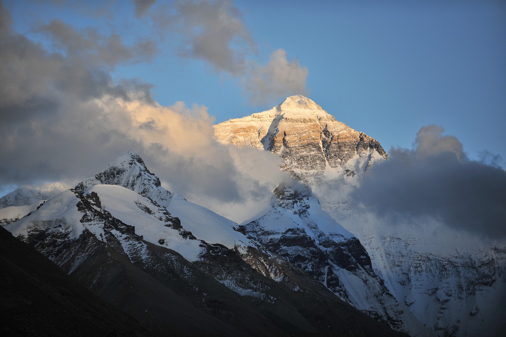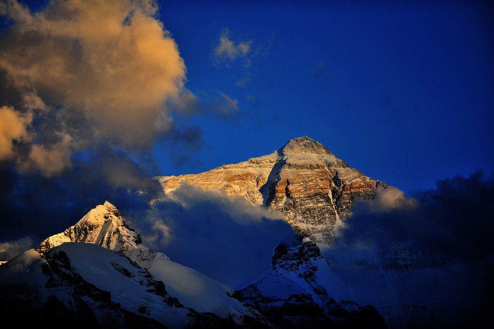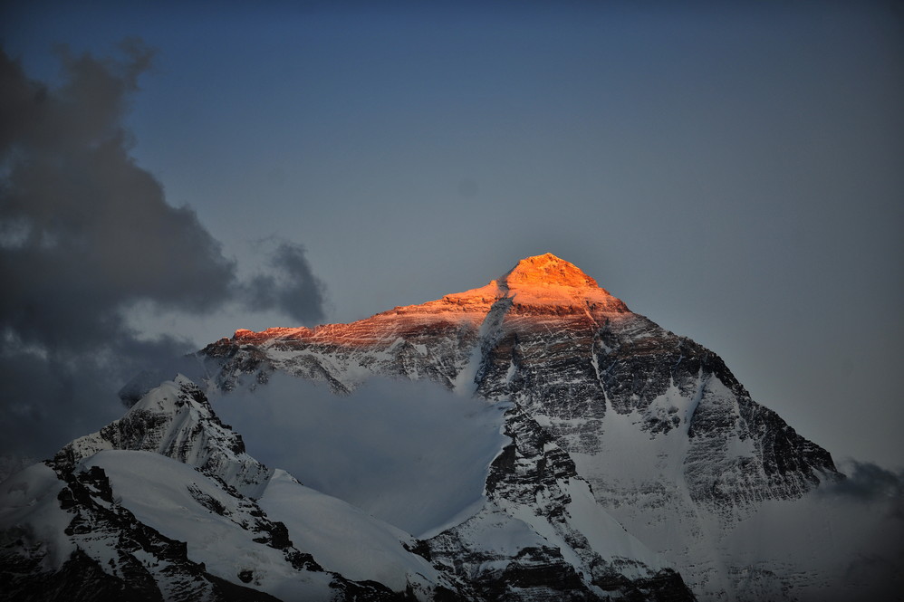 珠峰的顶很清晰展示在我们面前,一些云团还是会飘过来,在日落的余晖映照下,分外美丽!而且太阳渐渐下去,两个山顶和云彩的颜色更金黄!和bobi、太太不停拍,相机都不知道拍了多少了!我们只能一边庆幸运气好,一边冒着寒风拍照,太太有点不高兴说我不帮他拍。